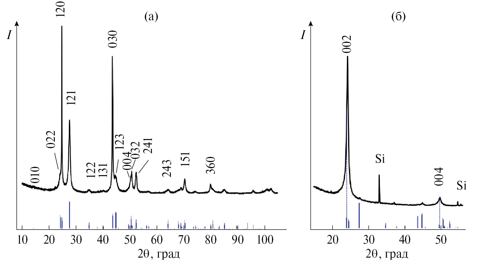 В работах [58, 60] приведены результаты исследования синтезированных материалов методами ИК-Фурье-спектроскопии пропускания, комбинационного рассеяния света, ЭДС-микроанализа. Данные РФА, приведенные на рис. 7, подтверждают, что оба образца, изображения которых представлены на рис. 6, имеют кристаллическую структуру тисонита. Однако на рентгенограмме рис. 7а слабо выражены рефлексы от [001] и смежных направлений, что подтверждает морфологию пленки, состоящей из двумерных кристаллов, имеющих преимущественную ориентацию нормально к поверхности подложки. Противоположная картина отражается на рентгенограмме, приведенной на рис. 7б, которая содержит только пики серии направлений [001], характерных для кристаллической структуры тисонита, и свидетельствует о значительном текстурировании пленки, когда большая часть составляющих ее частиц ориентирована своей осью с перпендикулярно поверхности пластины кремния в соответствии с изображением на рис. 6б.