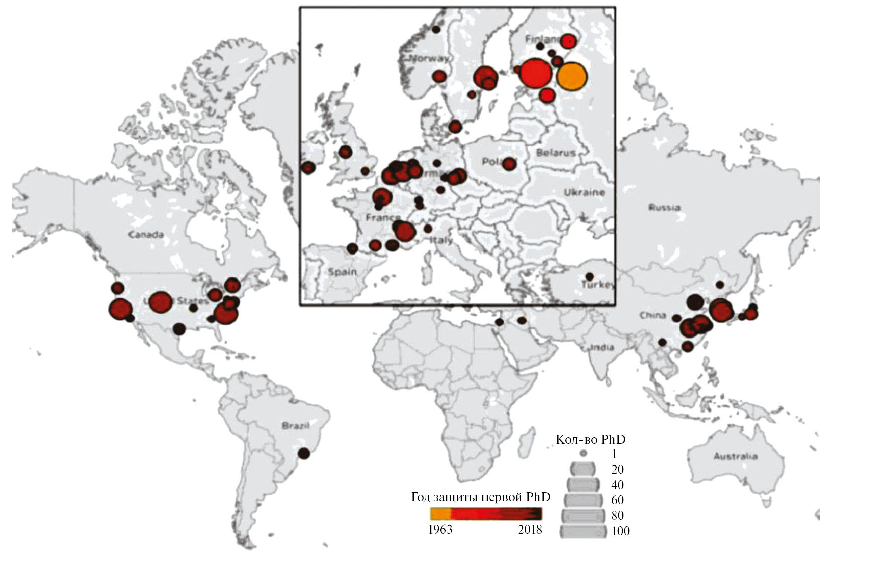 Первые публикации, посвященные методу МН, в исследованиях зарубежных ученых появились лишь в конце 70-х гг. прошлого века в таких странах, как Финляндия, Болгария, ГДР и др. [5–10]. В зарубежных публикациях в настоящее время метод МН чаще всего имеет название “атомно-слоевое осаждение” (АСО, Atomic Layer Deposition – ALD). Начиная с середины 80-х гг. XX века количество публикаций в указанном направлении в мире росло в геометрической прогрессии, а за период с 2010 по 2020 гг. выросло в три раза (рис. 1). Безусловно, существенное влияние на увеличение числа работ по МН оказало развитие в мире нанотехнологических исследований [12], а метод МН – это классический пример химической нанотехнологии. Сегодня исследования в области МН/АСО проводятся во всех развитых странах и на всех континентах (рис. 2).