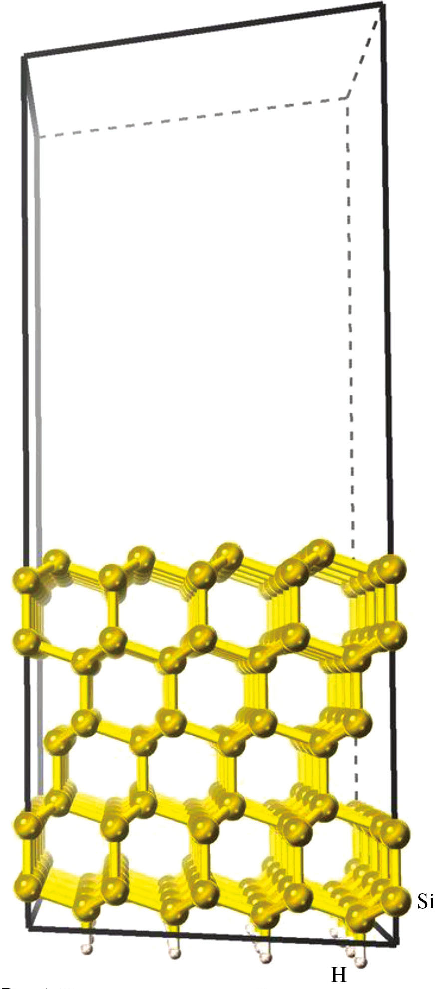 Исследуемая система была построена следующим образом. Вначале из элементарной ячейки кремния с кубической симметрией Fd3m создали поверхность с направлением (111) по оси z и толщиной ~15 Å. Затем из нее сделали суперъячейку размером 4 × 4 по осям x и y, т.е. размером 15.36 × 15.36 Å. После этого над поверхностью добавили слой вакуума толщиной ~15 Å. Нижняя часть поверхности была терминирована атомами водорода, чтобы частично экранировать нежелательное взаимодействие по оси z через граничные условия [14]. Полученная таким образом суперъячейка размером 15.36 × 15.36 × 30 Å, содержащая 160 атомов кремния и 16 атомов водорода, представлена на рис. 1. Все атомы зациклены через периодические граничные условия по всем трем направлениям. В дальнейшем для простоты изображения атомы водорода, играющие вспомогательную роль, на рисунках не показаны. Приведенная техника создания поверхности кристалла является стандартной [14].