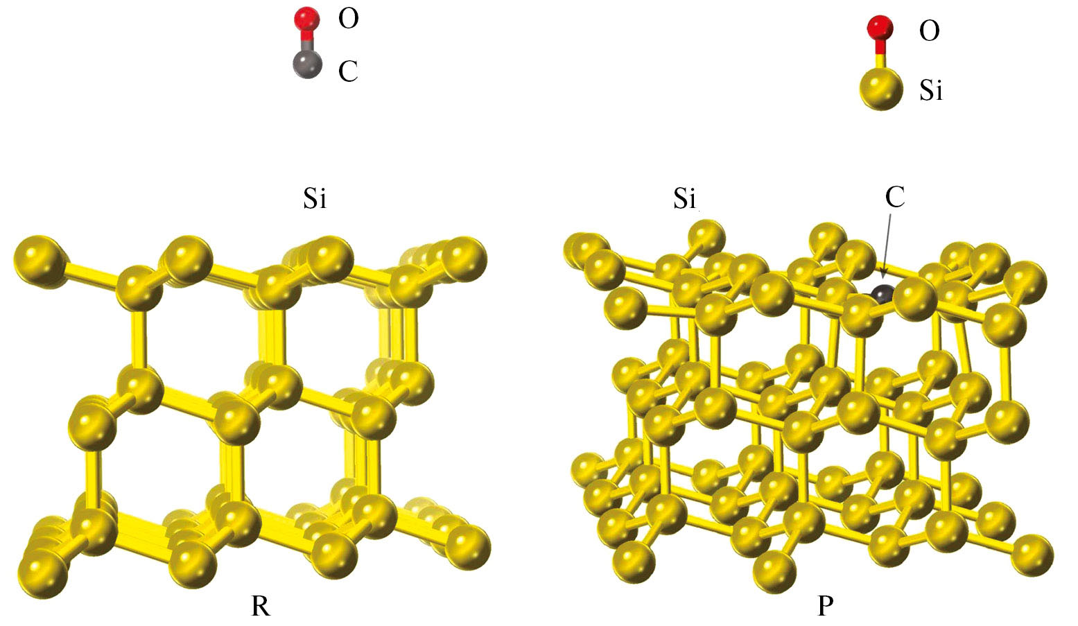 Рассчитан энергетический профиль данного химического превращения. Рассчитаны два промежуточных адсорбционных состояния и единственное переходное состояние. Показано, что оно представляет собой треугольник Si–O–C с длинами связей 1.94 Å (Si–O), 1.24 Å (C–O), 2.29 Å (Si–C). Таким образом, установлено, что поверхность (111) приводит к наиболее качественному росту кристалла SiC-3C.