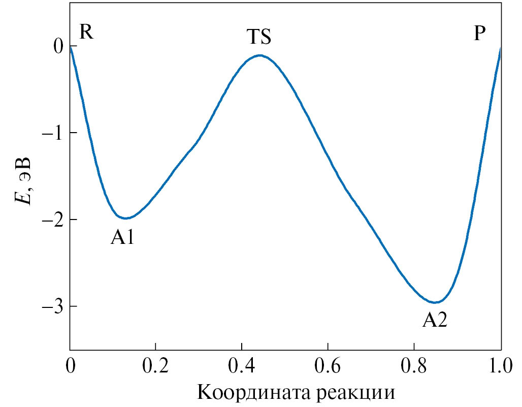 Рис. 6. Энергетический профиль реакции замещения (1) на поверхности (111). R – реагенты, P – продукты реакции, TS – переходное состояние, A1 и A2 – состояния адсорбции молекул CO и SiO на поверхности соответственно.