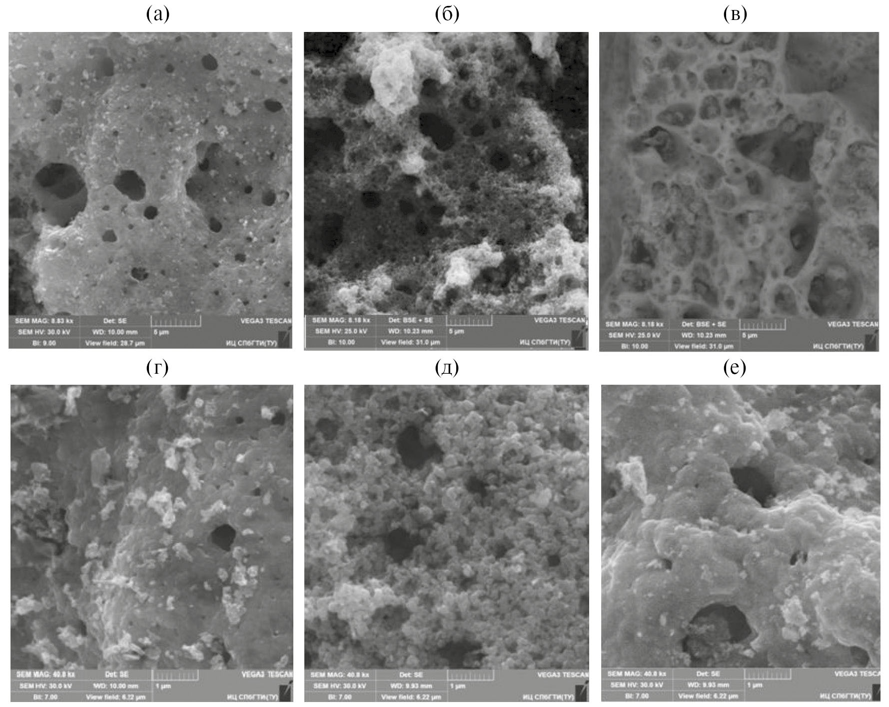 Морфологию и элементный состав полученных композитов исследовали методами сканирующей электронной микроскопии и рентгеноспектрального микроанализа с использованием растрового электронного микроскопа TescanVega 3 SBH (Чехия), оснащенного приставкой рентгеноспектрального микроанализа Oxford INCA x-act (Великобритания).
