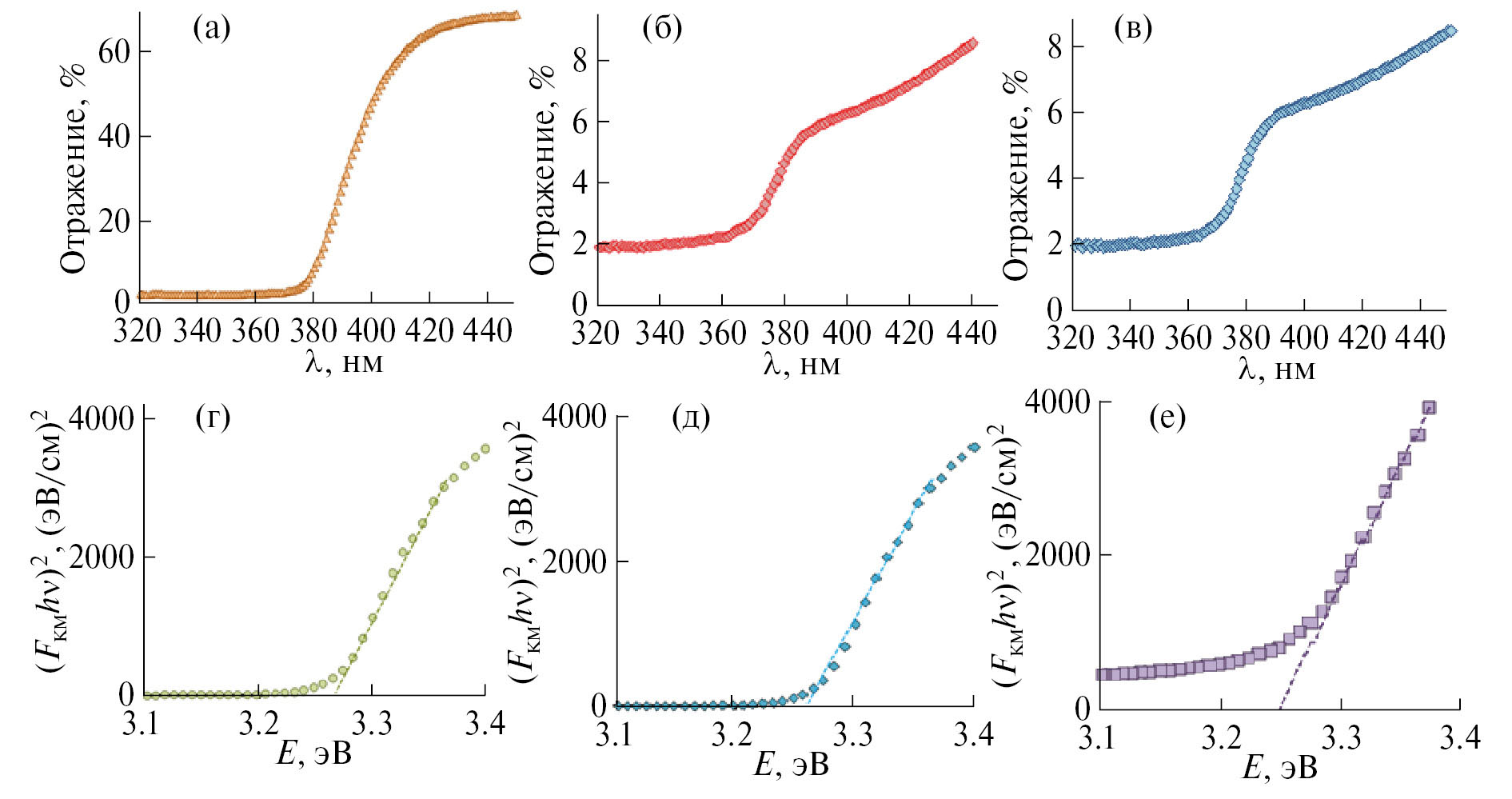 Зависимости (FKM ∙ hí)2 = f(hí) для образцов Zn, ZnMn9 и ZnMn17 приведены на рис. 3г–3е. Для всех материалов значения Eg составляют 3.25–3.26 эВ, что близко к значению ширины запрещенной зоны ZnO (3.27 эВ) [25].
