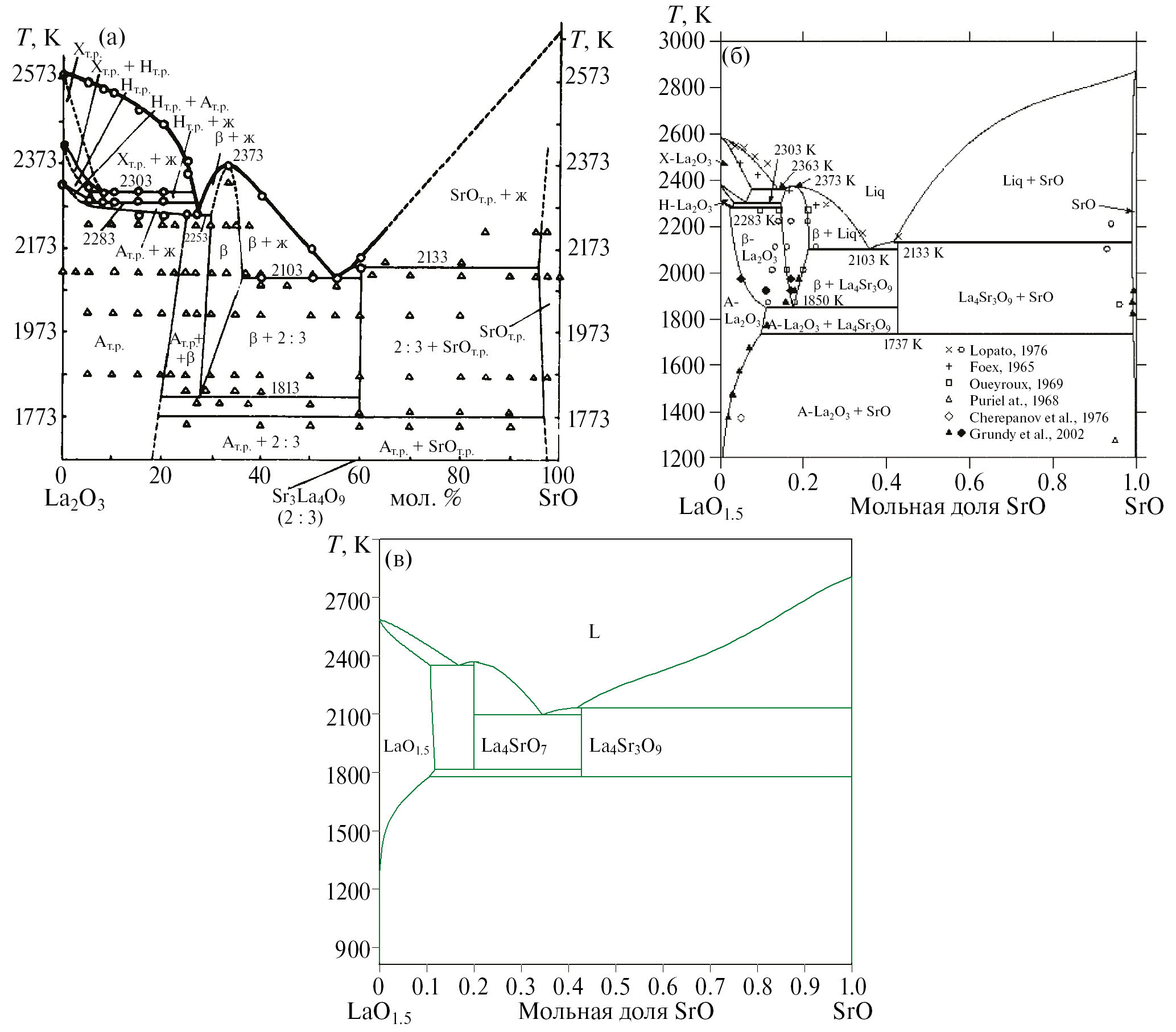 Рис. 1. Фазовая диаграмма системы La2O3–SrO, воспроизведенная из работы Лопато [34] (а), работы Гранди и др. [35] (б), базы данных NUCLEA [25] (в).