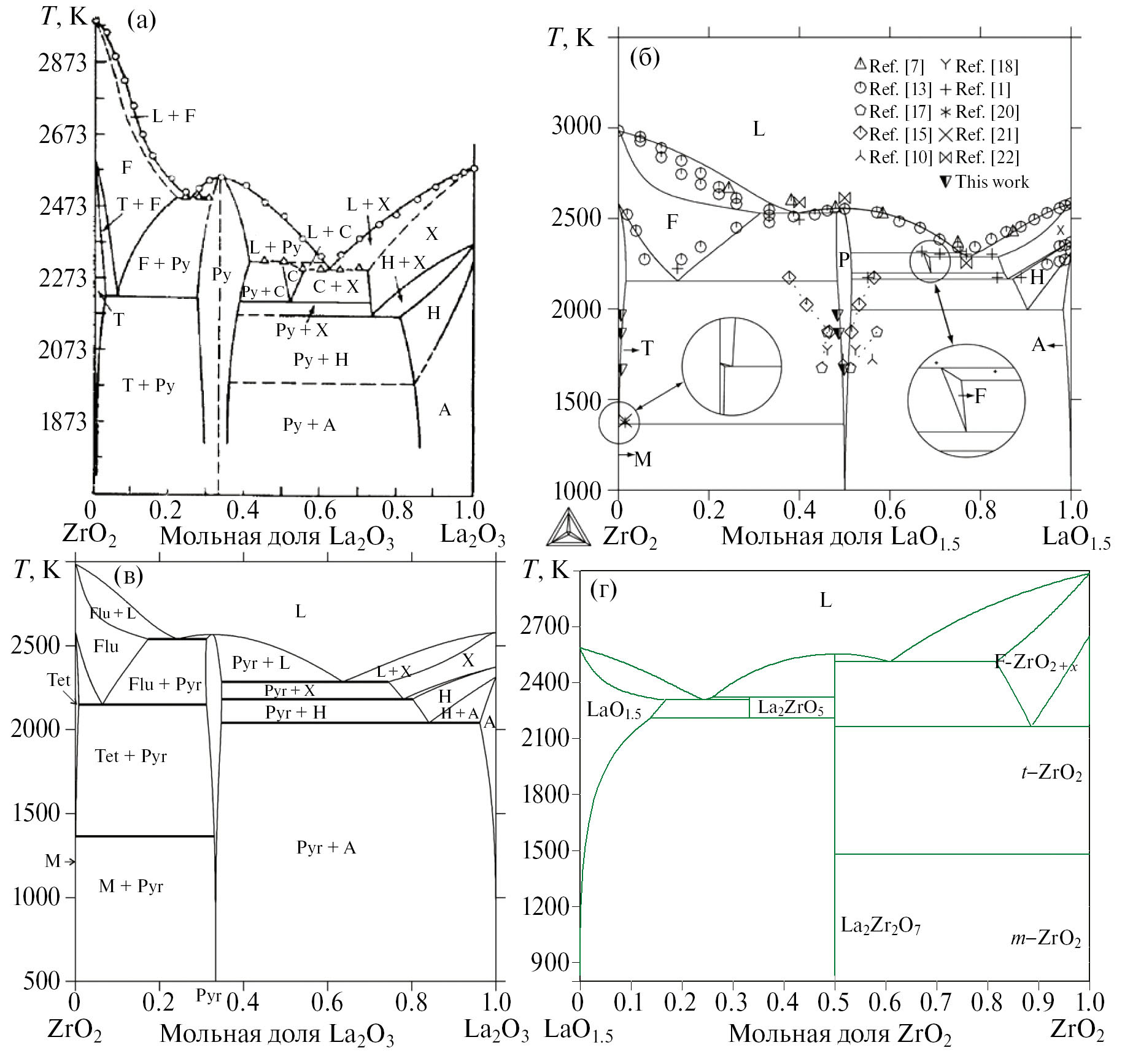 Рис. 2. Фазовая диаграмма системы La2O3–ZrO2, воспроизведенная из работы Андриевской [41] (а), работы Вана и др. [42] (б), работы Фабричной и др. [44] (в), базы данных NUCLEA [25] (г).