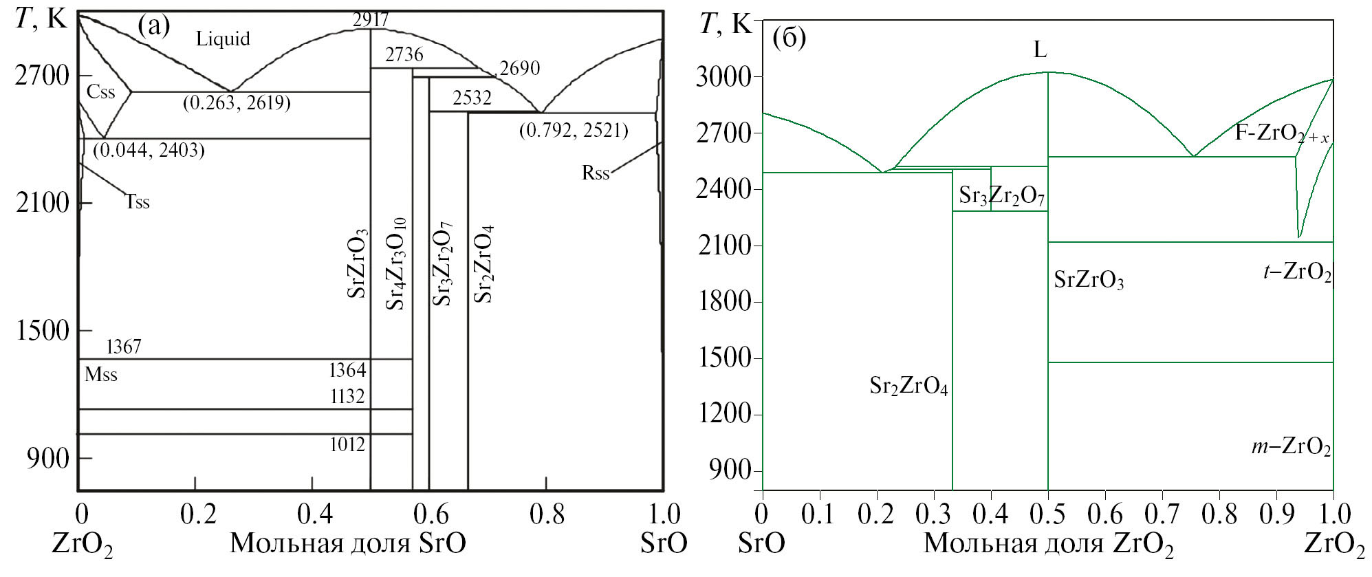 Рис. 3. Фазовая диаграмма системы SrO–ZrO2, воспроизведенная из работы [49] (а), базы данных NUCLEA [25] (б).