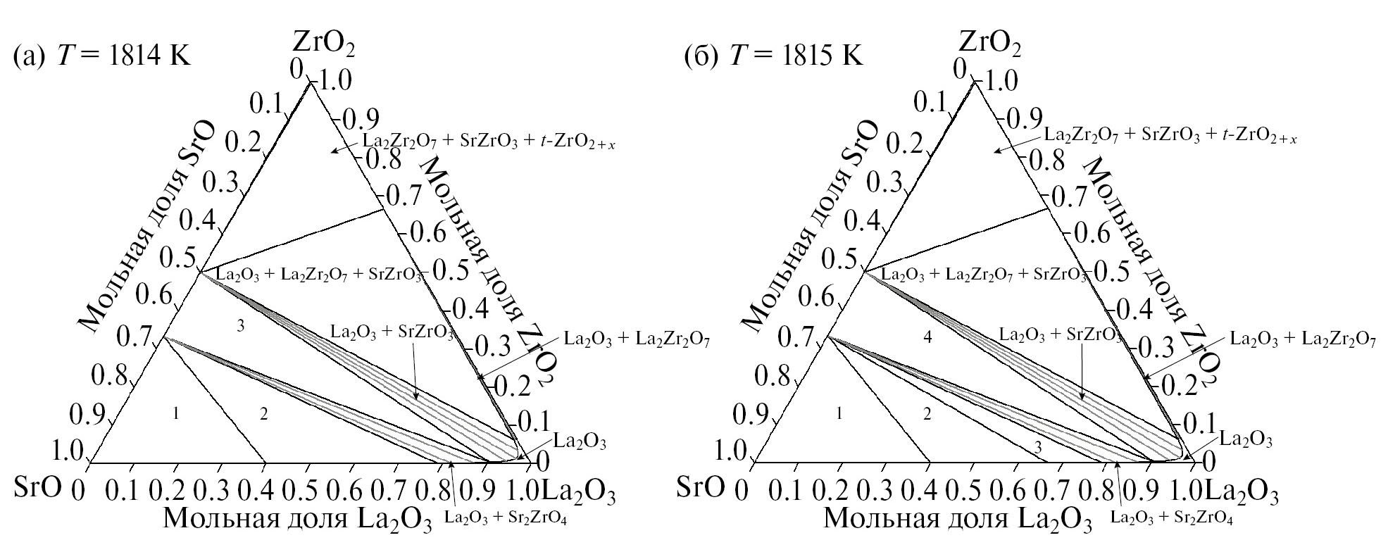 При дальнейшем увеличении температуры наблюдалось превращение моноклинной модификации оксида циркония в тетрагональную при температуре 1478 K и расширение области гомогенности твердого раствора на основе La2O3 и, как следствие, полей двухфазных равновесий оксида лантана с цирконатами самария (рис. 5а). При температуре 1777 K в системе La2O3–SrO образуется соединение La4Sr3O9. По этой причине на изотермическом сечении фазовой диаграммы системы La2O3–SrO–ZrO2, рассчитанном при 1778 K и представленном на рис. 5б, вместо одного трехфазного равновесия La2O3 + SrO + Sr2ZrO4 появляются два трехфазных равновесия: La4Sr3O9 + SrO + Sr2ZrO4 и La2O3 + La4Sr3O9 + Sr2ZrO4. Кроме того, по мере увеличения протяженности области гомогенности твердого раствора на основе La2O3 проявилось поле двухфазного равновесия La2O3 + La2Zr2O7. По этой причине далее под формулой La2O3 будет пониматься твердый раствор на основе оксида лантана.