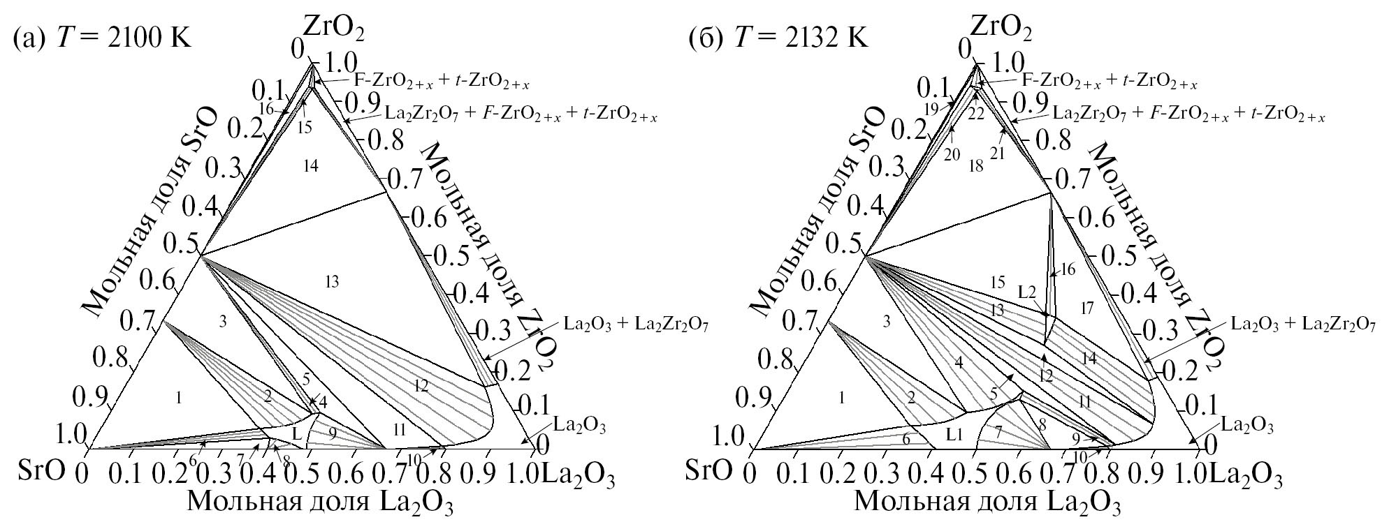 Рис. 7. Изотермические сечения фазовой диаграммы системы La2O3–SrO–ZrO2, рассчитанные в настоящей работе с использованием базы данных NUCLEA [25] при температуре 2100 K (а): 1 – L + SrO + Sr2ZrO4, 2 – L + Sr2ZrO4, 3 – L + SrZrO3 + Sr2ZrO4, 4 – L + SrZrO3, 5 – L + La4SrO7 + SrZrO3, 6 – L + SrO, 7 – L + La4Sr3O9 + SrO, 8 – L + La4Sr3O9, 9 – L + La4SrO7, 10 – La2O3 + La4SrO7, 11 – La2O3 + La4SrO7 + SrZrO3, 12 – La2O3 + SrZrO3, 13 – La2O3 + La2Zr2O7 + SrZrO3, 14 – La2Zr2O7 + SrZrO3 + F–ZrO2+x, 15 – SrZrO3 + F–ZrO2+x, 16 – SrZrO3 + F–ZrO2+x + t-ZrO2+x; при температуре 2132 K (б): 1 – L1 + SrO + Sr2ZrO4, 2 – L1 + Sr2ZrO4, 3 – L1 + SrZrO3 + Sr2ZrO4, 4 – L1 + SrZrO3, 5 – L1 + La2O3 + SrZrO3, 6 – L1 + SrO, 7 – L1 + La4SrO7, 8 – L1 + La2O3 + La4SrO7, 9 – L1 + La2O3, 10 – La2O3 + La4SrO7, 11 – La2O3 + SrZrO3, 12 – L2 + La2O3 + SrZrO3, 13 – L2 + SrZrO3, 14 – L2 + La2O3, 15 – L2 + La2Zr2O7 + SrZrO3, 16 – L2 + La2Zr2O7, 17 – L2 + La2O3 + La2Zr2O7, 18 – La2Zr2O7 + SrZrO3 + F–ZrO2+x, 19 – SrZrO3 + F–ZrO2+x + t-ZrO2+x, 20 – SrZrO3 + F–ZrO2+x, 21 – La2Zr2O7 + F–ZrO2+x, 22 – F–ZrO2+x. Серые линии соответствуют нодам, соединяющим составы сосуществующих фаз в двухфазных равновесиях.