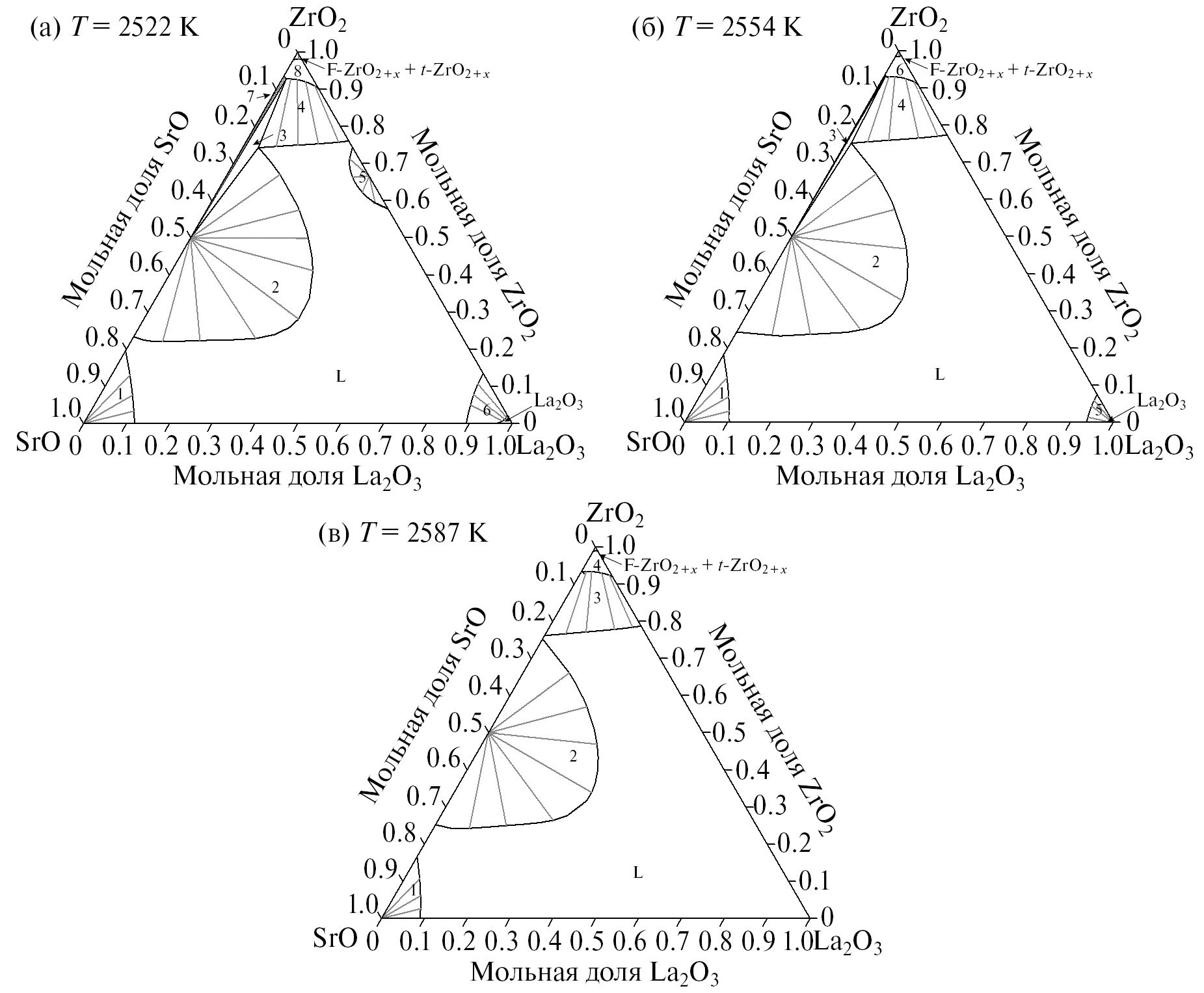 Последующий рост температуры приводит к последовательному плавлению фаз в бинарных системах. При температурах 2507 и 2521 K протекает инконгруэнтное плавление Sr2ZrO4 и Sr3Zr2O7 соответственно. По этой причине на сечении фазовой диаграммы системы La2O3–SrO–ZrO2 при температуре 2522 K отсутствуют фазовые равновесия с участием указанных цирконатов стронция (рис. 9а). Однако сохраняются двухфазные равновесия расплава с SrO (поле 1 на рис. 9а), SrZrO3 (поле 2), F–ZrO2+x (поле 4), La2Zr2O7 (поле 5) и La2O3 (поле 6), а также равновесия SrZrO3 + F–ZrO2+x (поле 7) и растворов на основе кубической и тетрагональной модификаций оксида циркония. Дальнейшее увеличение температуры приводит к плавлению La2Zr2O7 и исчезновению равновесия L + La2Zr2O7 на сечении при температуре 2554 K (рис. 9б). На изотермическом сечении фазовой диаграммы системы La2O3–SrO–ZrO2 при температуре 2587 K (рис. 9в) в дополнение к исчезновению области гомогенности La2O3 и поля равновесия L + La2O3 вследствие плавления оксида лантана при температуре 2586 K не наблюдаются какие-либо поля трехфазных равновесий и отсутствует равновесие SrZrO3 + F–ZrO2+x, поскольку область расплава коснулась бинарной системы SrO–ZrO2 в интервале составов от SrZrO3 до ZrO2. Таким образом, при температурах >2587 K в рассматриваемой системе существуют только двухфазные равновесия c расплавом: оксида стронция, метацирконата стронция и твердого раствора на основе оксида циркония со структурой флюорита. Кроме того, устойчива область гомогенности F–ZrO2+x, а также двухфазное равновесие F–ZrO2+x + t-ZrO2+x, которое будет существовать до превращения индивидуального тетрагонального оксида циркония в кубическую фазу при температуре 2650 K.