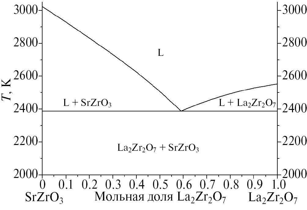 Рассчитанное в настоящей работе сечение La2Zr2O7–SrZrO3 (рис. 10) является квазибинарным, то есть составы всех фаз двухфазных равновесий лежат на рассматриваемом сечении и отсутствуют поля трехфазных равновесий во всем изученном температурном интервале. Следовательно, точка на рис. 10, соответствующая равновесию La2Zr2O7 + SrZrO3 → L при температуре 2387 K и составе расплава 22.8 мол. % La2O3, 15.8 мол. % SrO, 61.4 мол. % ZrO2, является эвтектической в квазибинарной системе La2Zr2O7–SrZrO3, а в трехкомпонентной системе La2O3–SrO–ZrO2 – аналогом седловой точки, то есть с наибольшим значением температуры ликвидуса на пути первичной кристаллизации между второй и четвертой эвтектиками из табл. 1 с наименьшим значением температуры ликвидуса на пути между La2Zr2O7 и SrZrO3 (рис. 10). Это становится более очевидным, если рассмотреть рис. 8б, из которого следует, что эвтектика квазибинарной системы La2Zr2O7–SrZrO3 образуется при касании областей гомогенности расплавов L1 и L2 на концентрационном сечении La2Zr2O7–SrZrO3 и исчезновении равновесий L1 + La2Zr2O7 + SrZrO3 (поле 6) и L2 + La2Zr2O7 + SrZrO3 (поле 10).