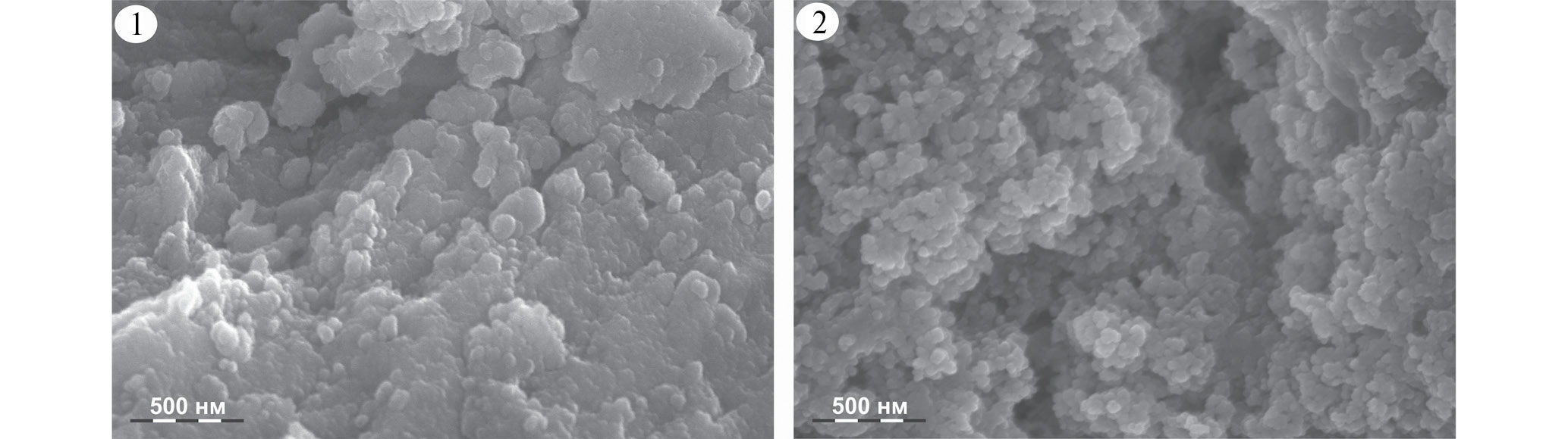 Морфология и структура исследуемых композитов при разном увеличении представлены на рис. 3 и 4 соответственно. Анализ СЭМ-изображений показывает, что полученные материалы состоят из агрегатов сферических структур с размером отдельных частиц ⁓50 нм с довольно развитой пористостью.