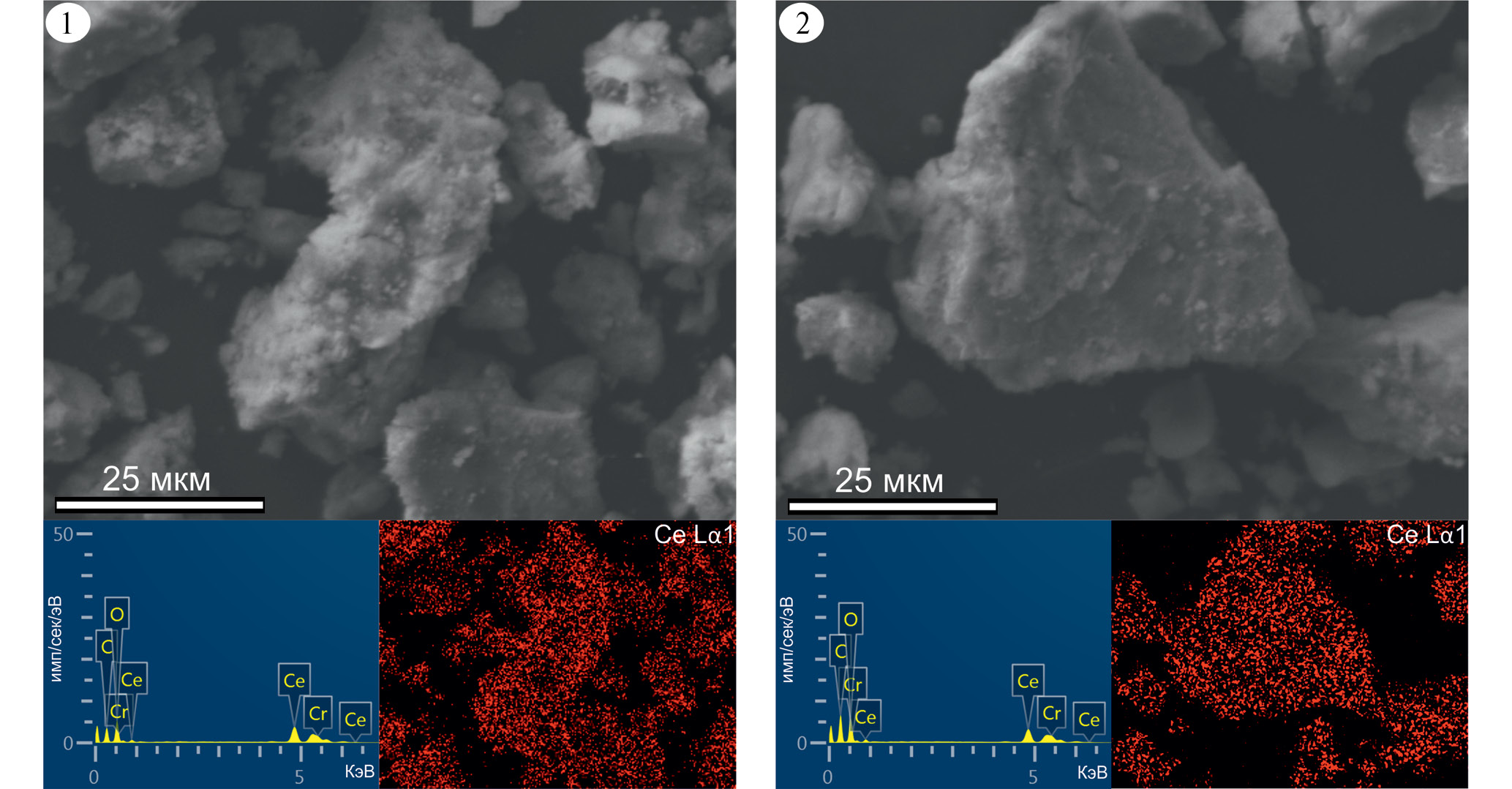 СЭМ-изображение с ЭДС-анализом и карта распределения церия приведены на рис. 4. Данные указывают на достаточно однородное распределение церия по поверхности композитов Сe_3_Chit и Ce_4_Chit.