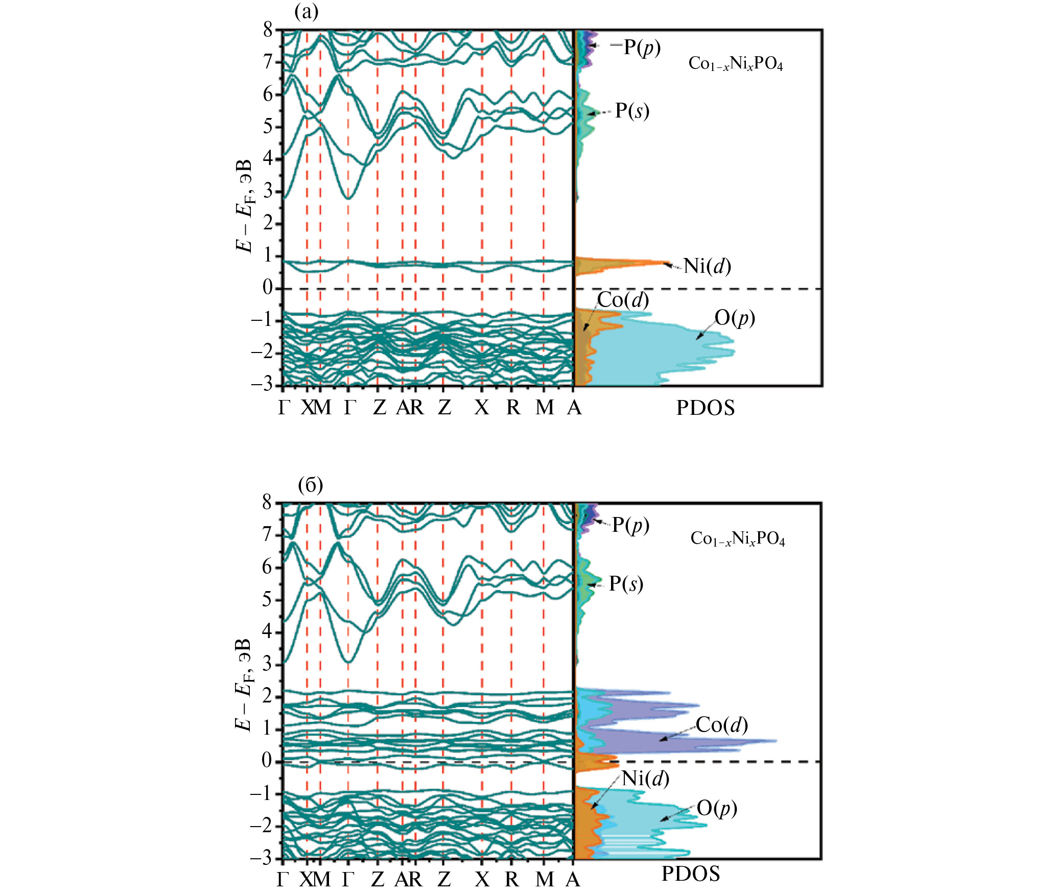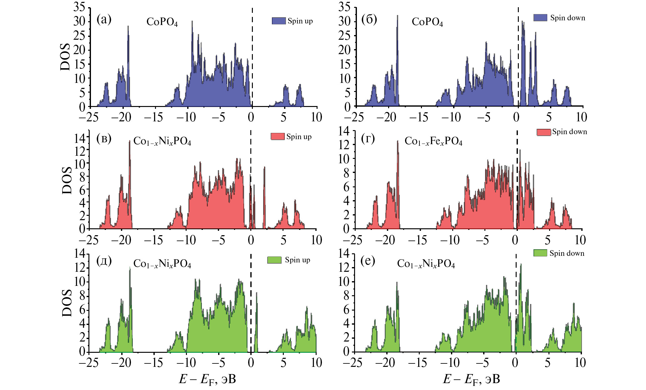 На рис. 2a–2г показано сравнительное исследование парциальных плотностей электронных состояний для электронов со спинами вверх и вниз для Co(PO4) и Fe- и Ni-легированного Co(PO4). Волновые функции O2p и Co3d сильно локализованы, а состояния O2p энергетически очень близки к состояниям Co3d, что свидетельствует о значительно сильном взаимодействии между O2p и Co3d. Верхние уровни валентной зоны Co(PO4) могут быть разложены на три основные области, а миноритарных спиновых состояний – пять: связывающие состояния σ, формируемые связями Op; в средней – связующие состояния t1u; и в верхней – антисвязующие Opπ*-состояния, где гибридизация с t2g-электронами Co незначительна. Плотность электронных уровней со спинами вверх в валентной зоне Co(PO4) DOS отсутствует примерно с –18.14 до –13 эВ и однородно распределяется от –13 до 0 эВ. Уровни в зоне проводимости равномерно распределяется до 8 эВ. Ширина запрещенной зоны для электронов со спинами вверх Еgu = 2.7 эВ. Распределение DOS для электронов со спинами вниз в валентной зоне значительно меньше вблизи уровня Ферми и распространяется приблизительно от –12.5 до –1.0 эВ, и имеется небольшое незаполненное состояние вблизи уровня Ферми от –1.1 эВ. В случае электронов со спинами вниз ширина запрещенной зоны имеет значения Еgd = 2.31 эВ, и в середине запрещенной зоны появляются локальные вакантные электронные состояния в основном за счет d-уровней атома кобальта.