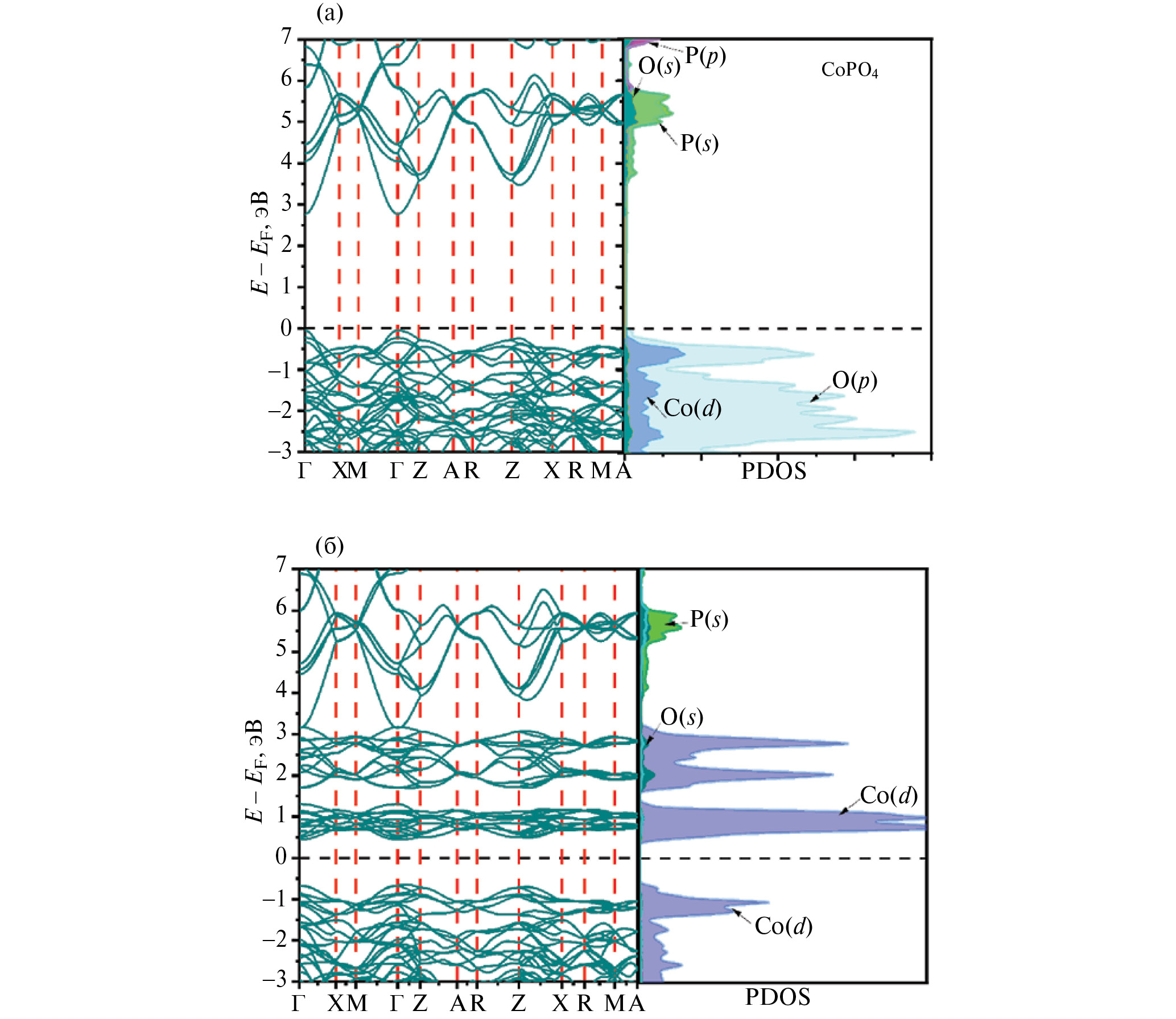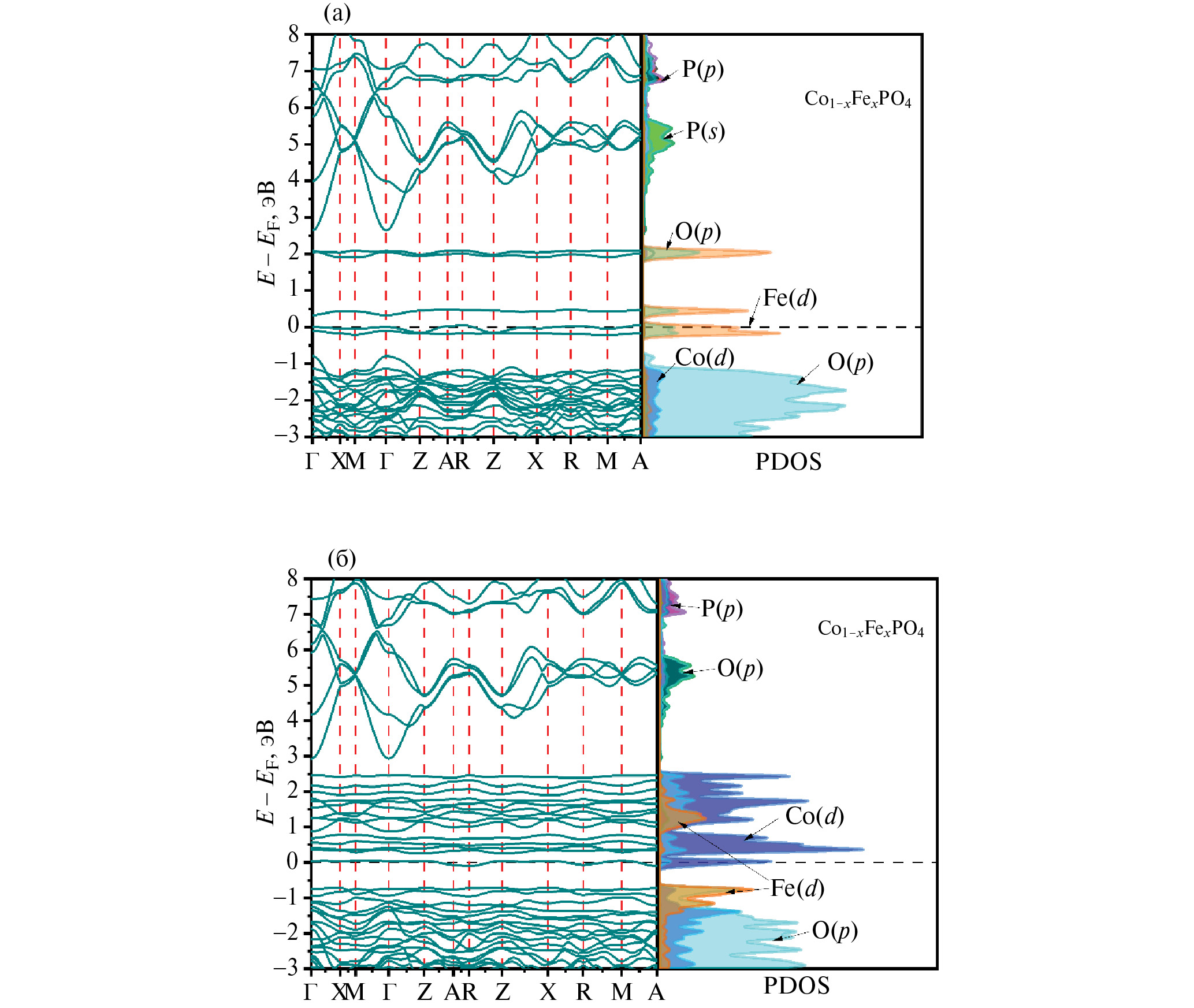 На рис. 2в, 2г представлены плотности электронных состояний для Co1–xFexPO4. При допировании фосфата кобальта атомами железа ширина запрещенной зоны немного увеличивается по сравнению с чистым CoPO4 и достигает до 3.4 эВ для электронов с доминирующим направлением спина. Уровни электронной зоны Co1–xFexPO4 состоят из пяти основных областей, где миноритарных спиновых состояний четыре. В спектре плотности электронных состояний со спином вверх и вниз в запрещенной зоне образуются вакантные d-орбитальные состояния атома Fe.