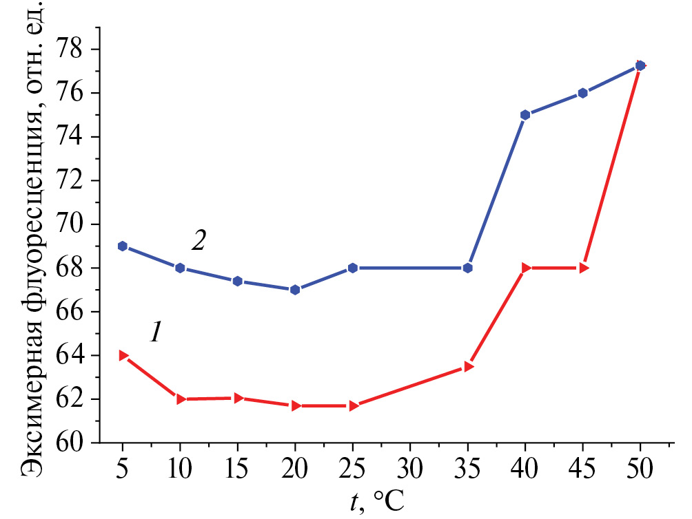 Из температурной зависимости интенсивности присутствующего в некоторых образцах эксимера можно судить о том, что с повышением температуры в образце становится все больше пирена в свободном состоянии (рис. 6). На отметке 50оС для всех образцов зафиксированы минимальные значения I3 к I1 при максимальном значении Iex. При повторном охлаждении вся система возвращается в исходное равновесное состояние, поэтому с уверенностью можно говорить о том, что процесс разрушения комплексов вследствие изменения температуры является обратимым.