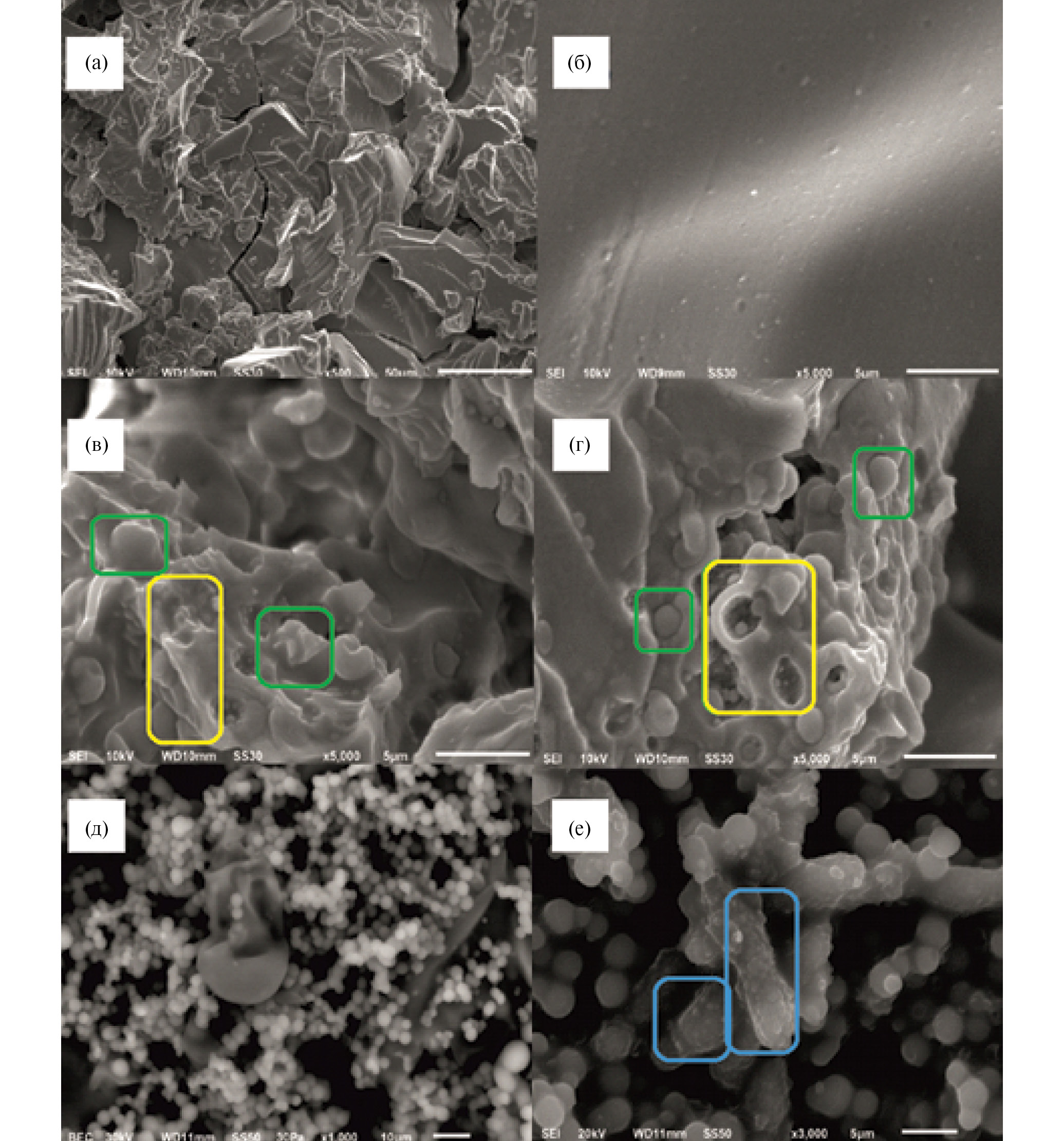 Рис. 2. Кислотный гидролиз в отсутствие клеток: а – бар-метка 50 мкм, б – бар-метка 5 мкм; в, г – кислотный гидролиз в присутствии клеток Ogataea polymorpha (бар-метка 5 мкм), д – щелочной гидролиз в отсутствие клеток (бар-метка 10 мкм), е – щелочной гидролиз в присутствии клеток Cryptococcus curvatus (бар-метка 5 мкм).