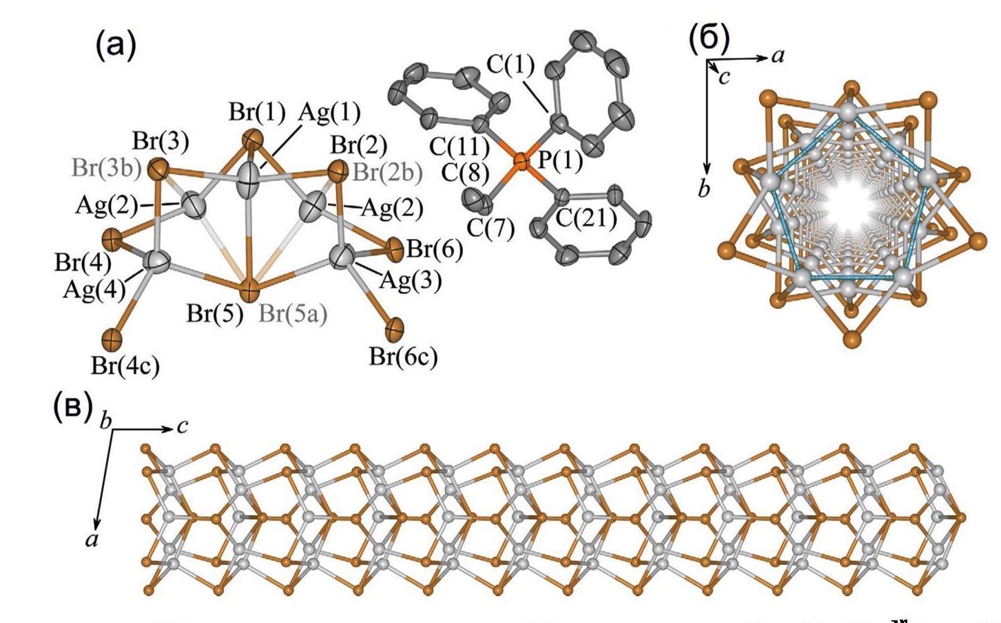 Внутри аниона II соседние Ag-центры контактируют друг с другом через более короткие, чем в анионе I, аргентофильные взаимодействия (d(Ag···Ag) = = 3.134(3)–3.213(3) Å) (рис. 2в), образуя таким образом с μ5-Br-ионами пентагональные пирамиды {Ag5Br}. В свою очередь, расстояния между μ5-Br-ионами близки к сумме ван-дер-ваальсовых радиусов атомов брома и составляют 3.668 Å (dVdW(Br···Br) = 3.66 Å [36]).
