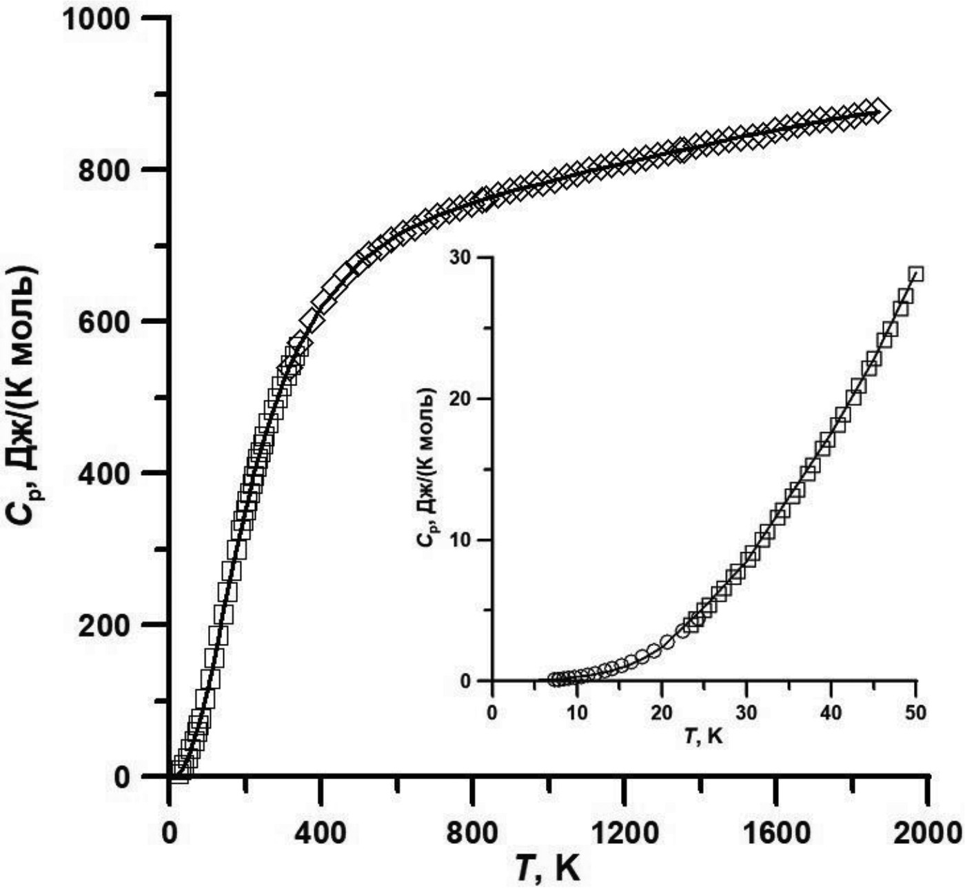 Измерение теплоемкости проводили методами релаксационной (PPMS-9, Quantum Design Inc.), адиабатической (БКТ-3 с блоком Аксамит-9, ИП Малышев) и дифференциальной сканирующей калориметрии (DSC 404F1 Pegasus, Netzsch). Перед этим точность определения теплоемкости проверяли измерением теплоемкости стандартных веществ (медь, бензойная кислота и корунд). Сглаживание экспериментальных значений и расчет термодинамических функций проводили с использованием опубликованного программного комплекса CpFit [23, 24].