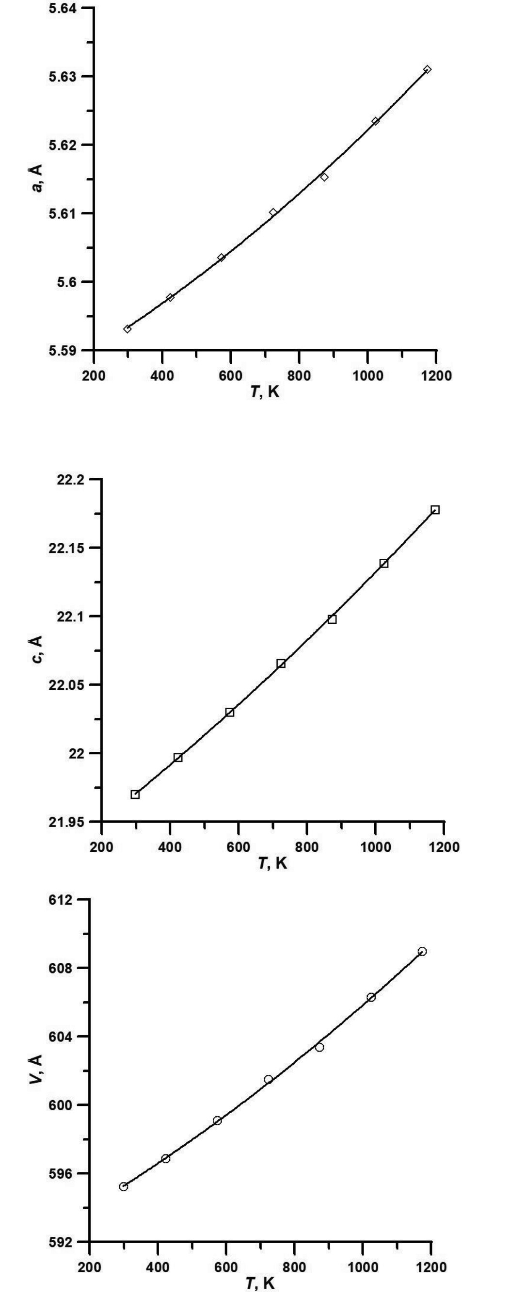 В результате изучения образца LaMgAl11O19 методом высокотемпературной рентгеновской дифракции при семи значениях температуры (рис. S6) рассчитаны температурные зависимости параметров элементарной ячейки a, c и V гексаалюмината магния-лантана со структурой магнетоплюмбита, представленные на рис. 4 и в табл. S5.