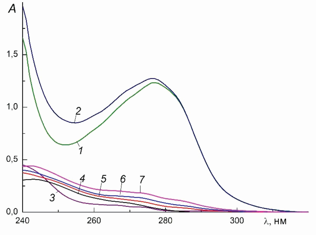 Спектры поглощения записывали на спектрофотометре СФ-2000 (ОКБ Спектр) в диапазоне длин волн 240–340 нм, l = 0.2–1 см.