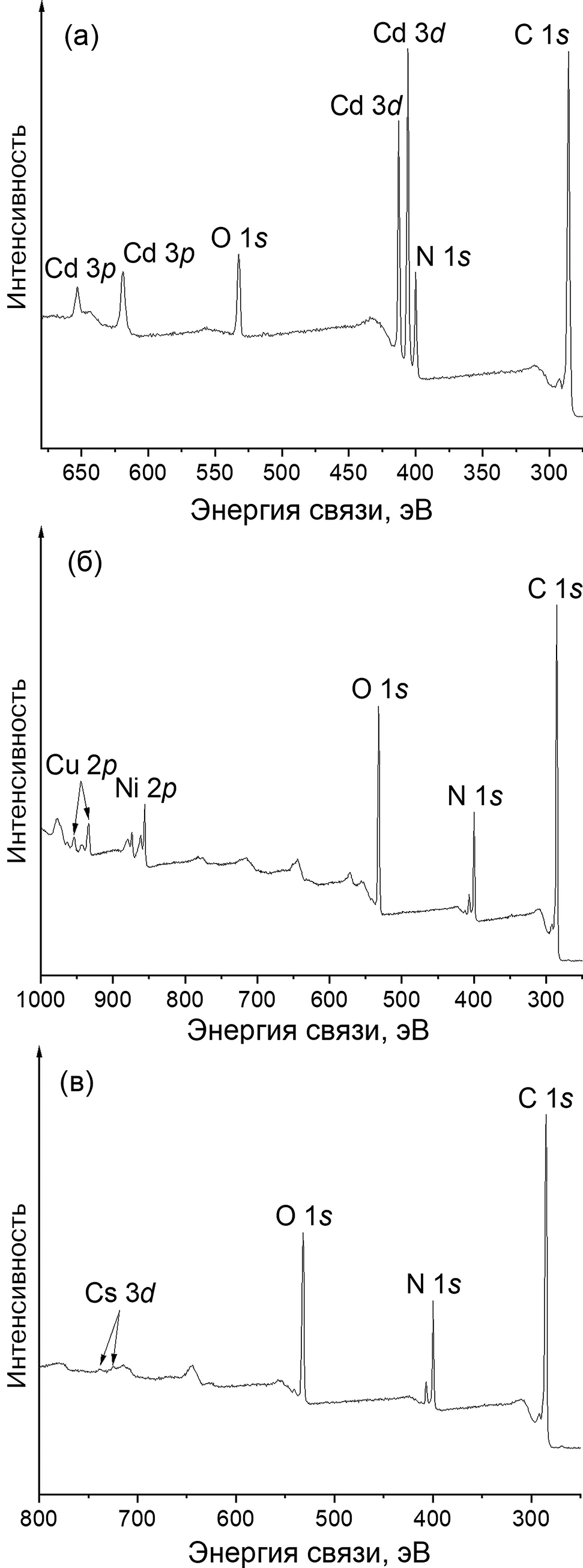 Рис. 11. Спектры РФЭС Ni-МОКС после контакта с ионами кадмия (а), меди (б), цезия (б).