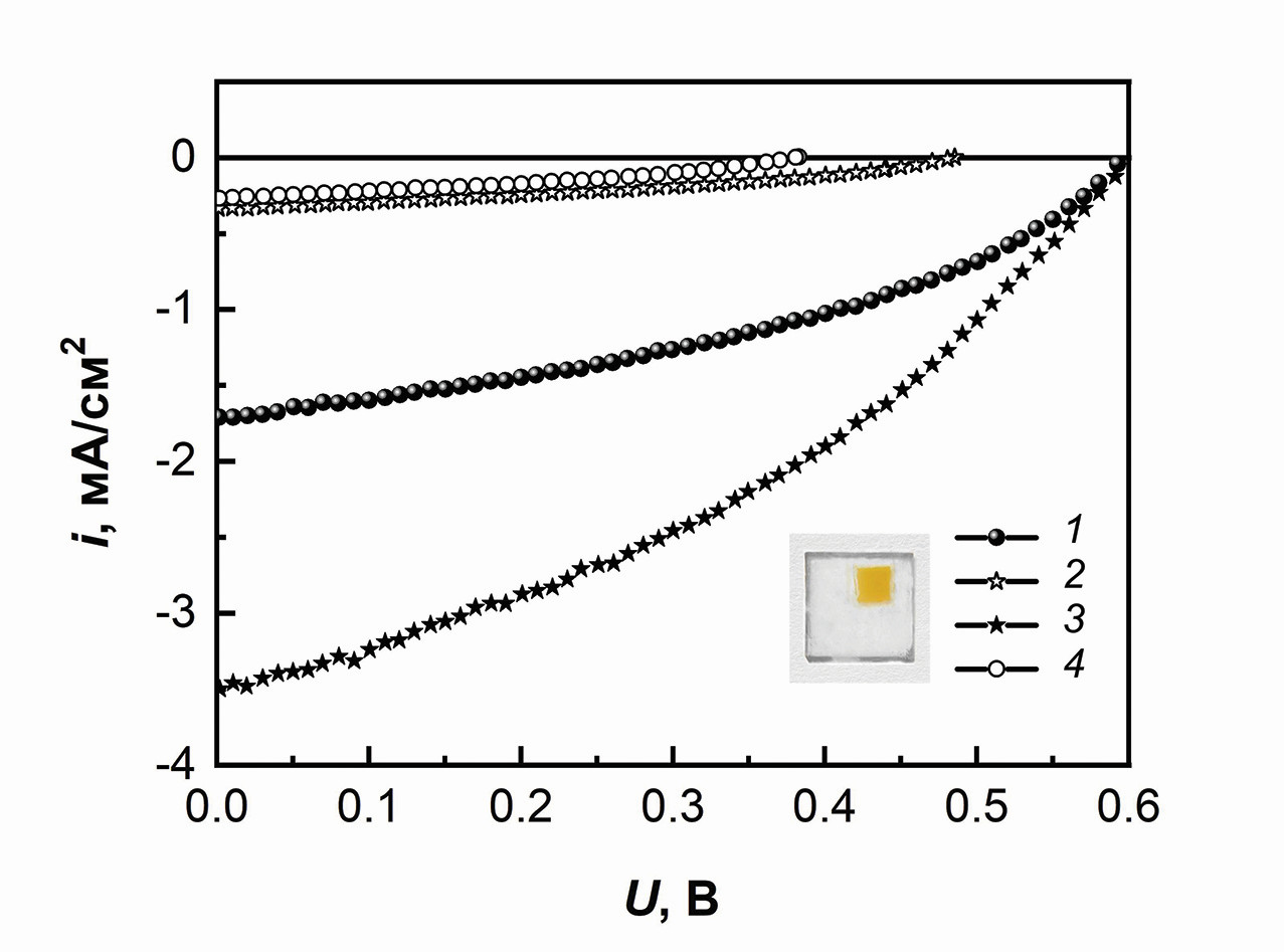 8. Fig. 7. Volt-ampere characteristics of samples of photoanodes 1-4 with dyes IS 4 and IS 9. The insert shows an image of a photoanode with an adsorbed dye.