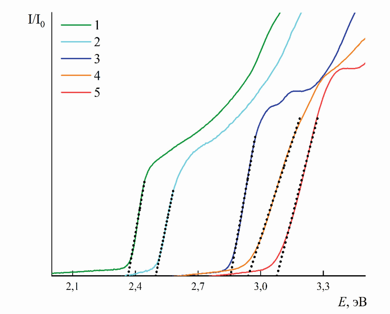 Рис. 4. Электронные спектры поглощения вблизи области краевого поглощения наночастиц: 1 – CsPbBr3; 2 – CsPbCl3–zBrz; 3 – CsPbCl3; 4 – CsPb1–yMnyCl3–zBrz; 5 – CsPb1–yMnyCl3.