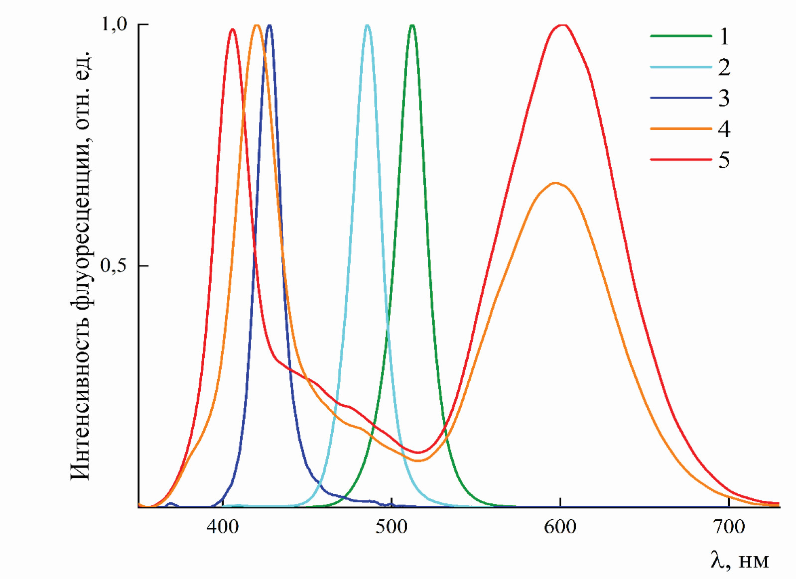 Рис. 5. Спектры фотолюминесценции наночастиц: 1 – CsPbBr3 (λвозб = 365 нм); 2 – CsPbCl3–zBrz (λвозб = = 365 нм); 3 – CsPbCl3 (λвозб = 365 нм); 4 – CsPb1–yMnyCl3–zBrz (λвозб = 227 нм); 5 – CsPb1–yMnyCl3 (λвозб = 241 нм).