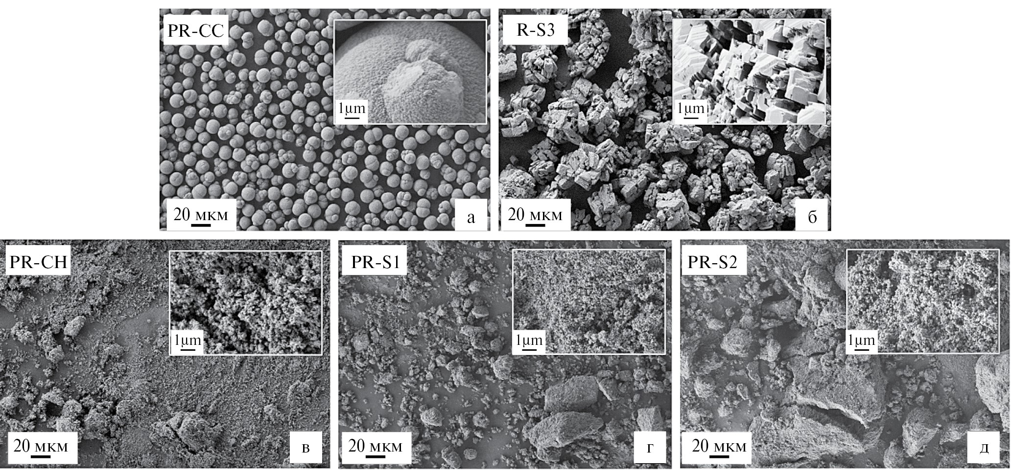 Рис. 1. Микрофотографии прекурсоров: карбонатного PR-CC (а), на основе оксалатов PR-S3 (б), а также на основе гидроксидов PR-CН (в), PR-S1 (г) и PR-S2 (д).