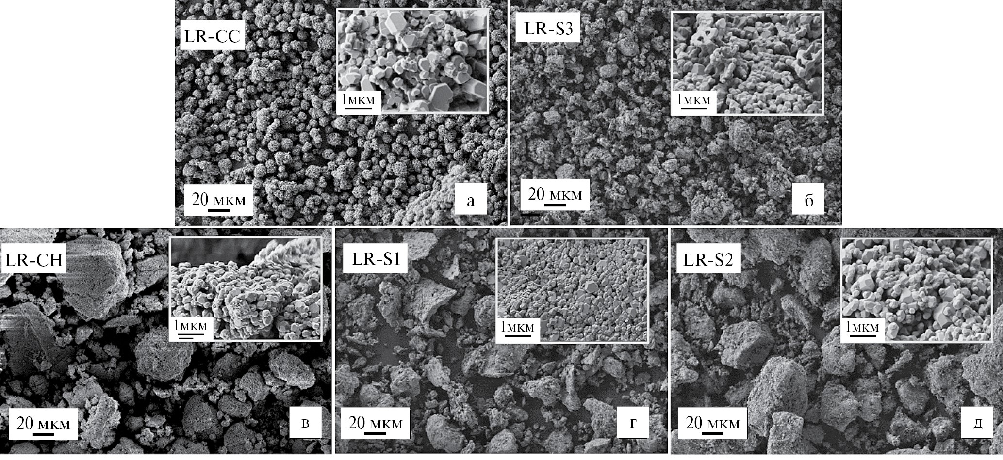 Рис. 2. Микрофотографии литированных оксидов LR-CC (а), LR-S3 (б), LR-CН (в), LR-S1 (г) и LR-S2 (д).