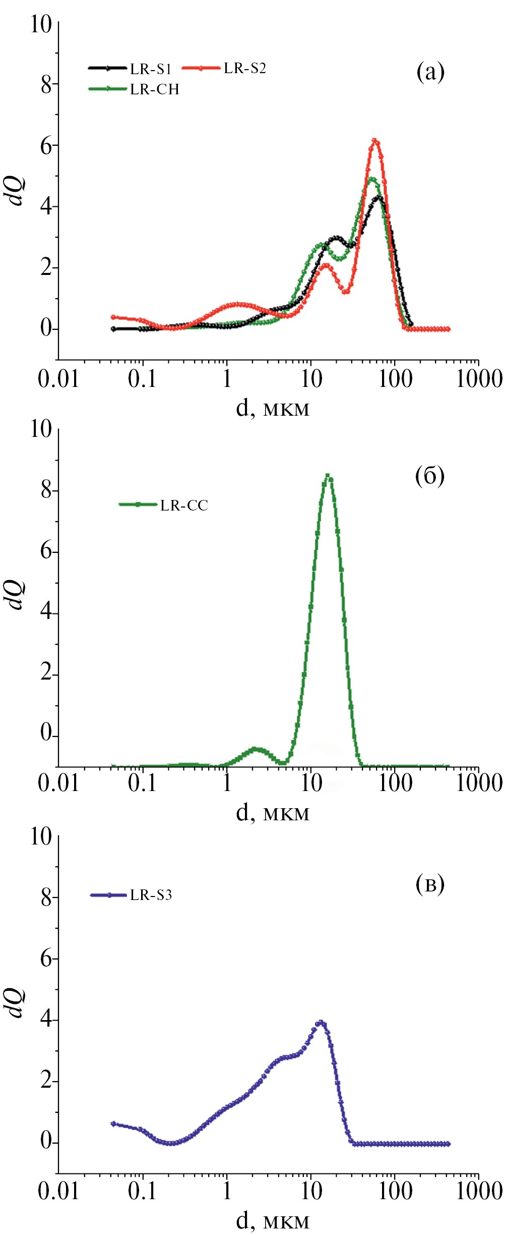 5. Fig. 3. Differential agglomerate size distribution curves for samples based on hydroxide precursors LR-CC, LR-S1, LR-S2 (a), carbonate precursor LR-CC (b) and oxalate precursor LR-S3 (c).