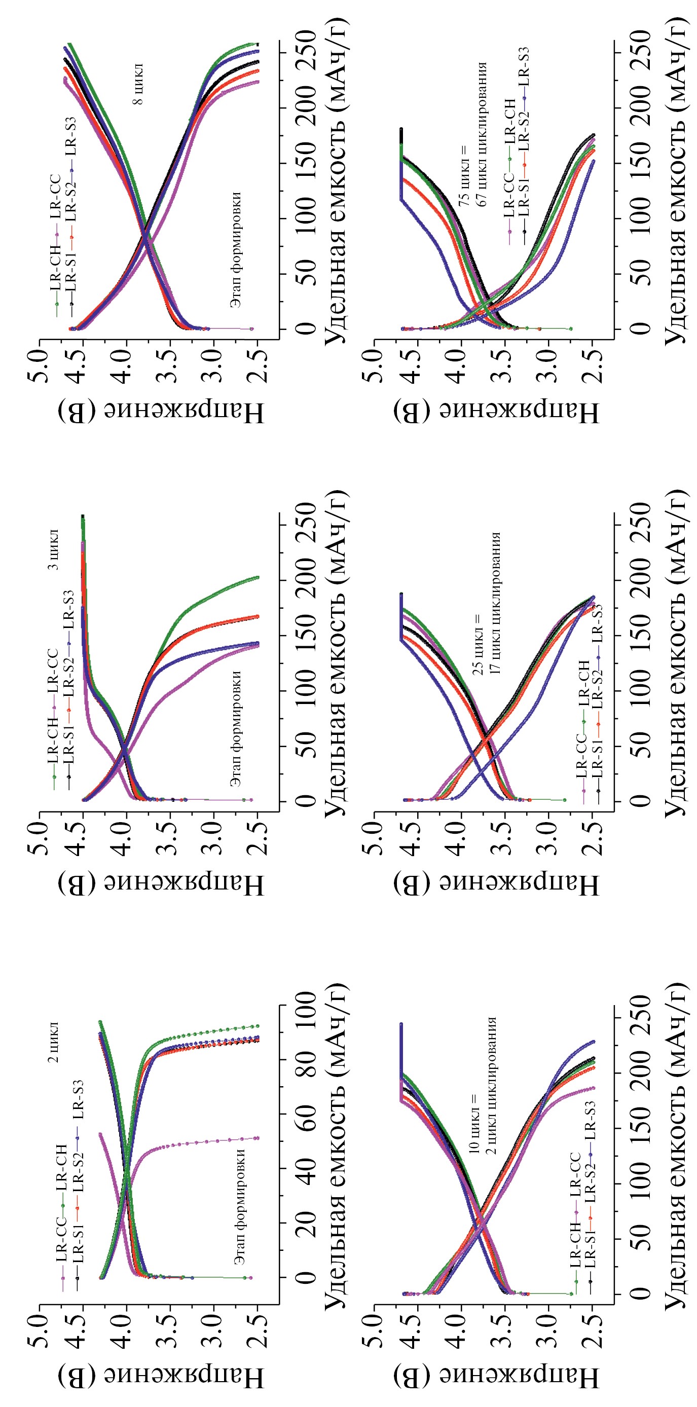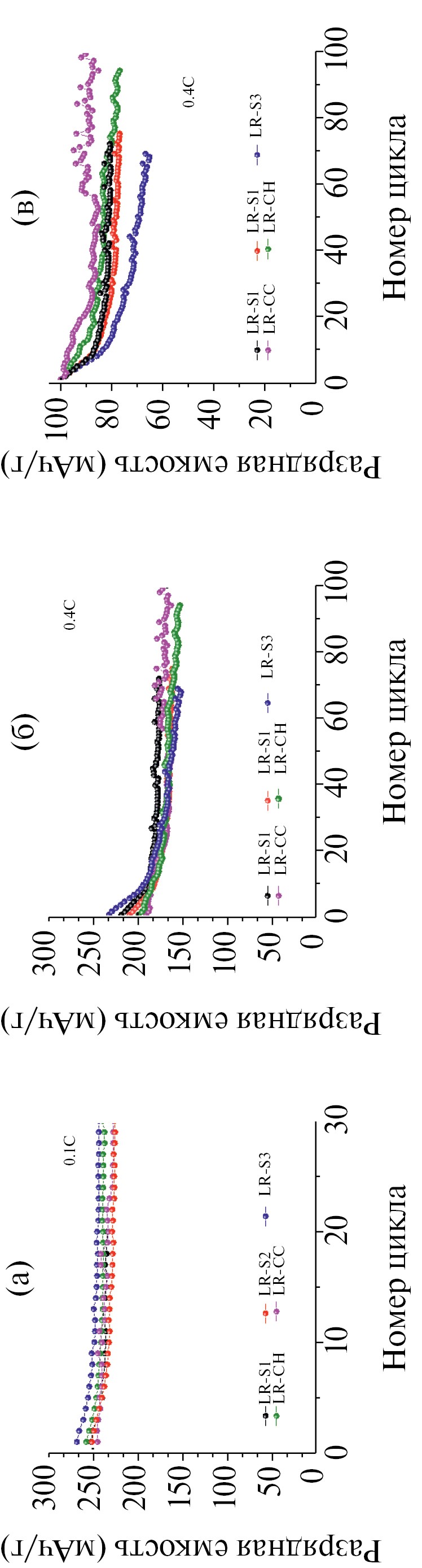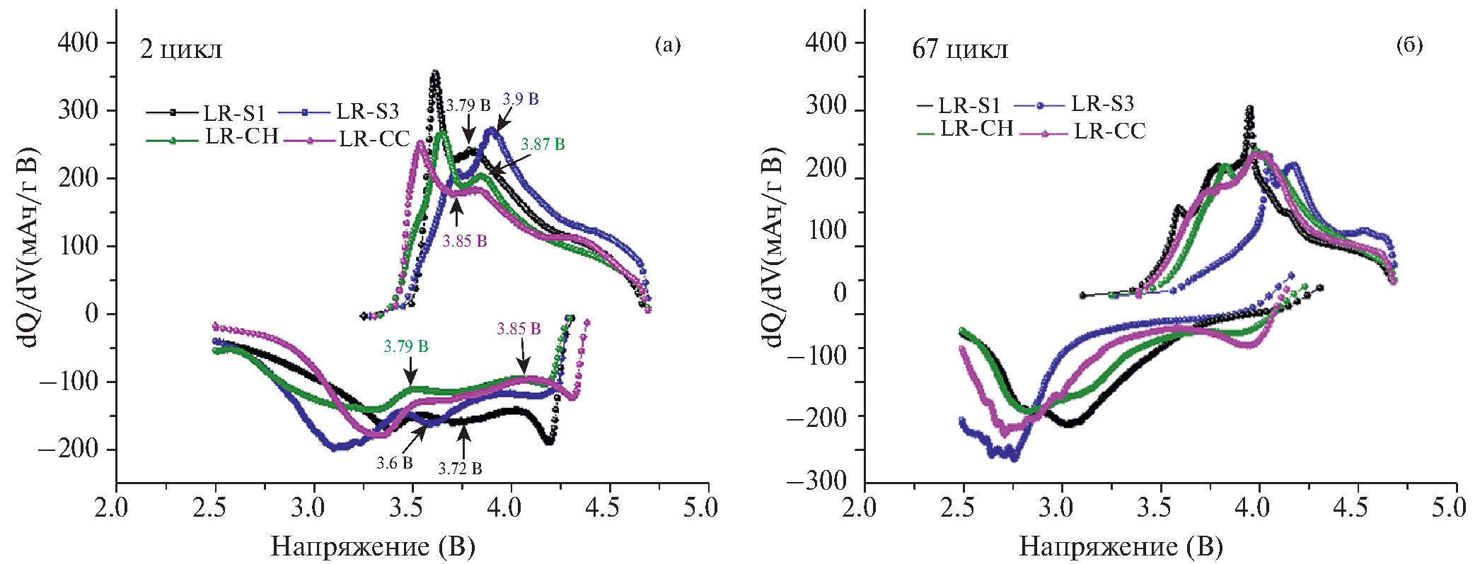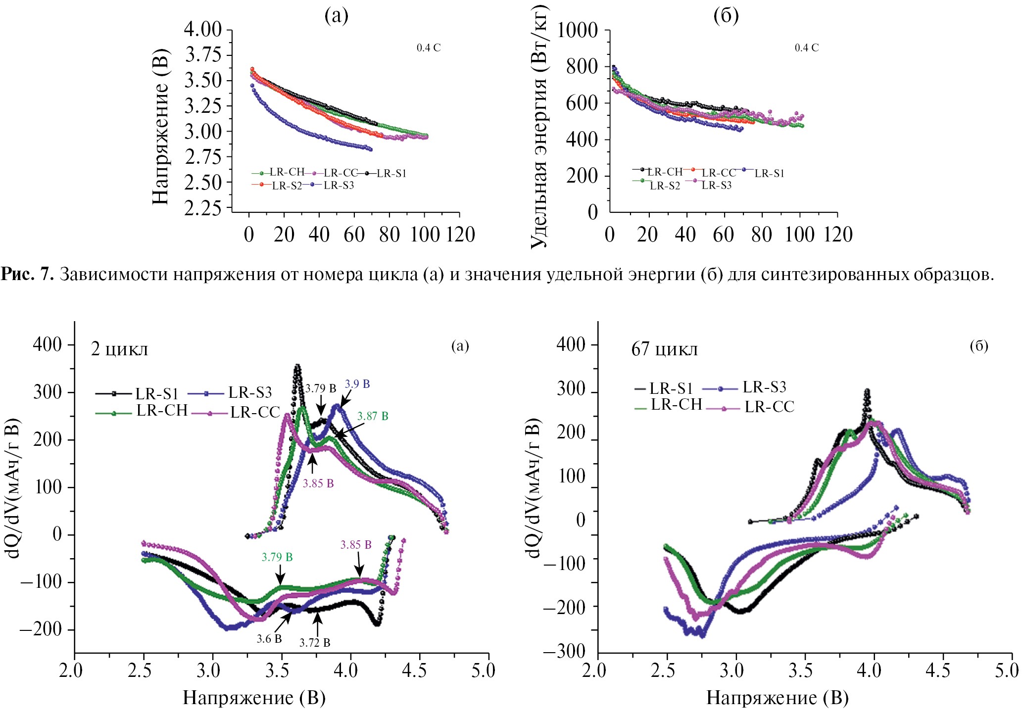 Катодная кривая отвечает восстановлению никеля и кобальта при напряжении 3.6–3.85 В и восстановлению Mn4+ до Mn3+ при напряжении ~3.3 В. Площадь под пиком восстановления марганца также максимальна для образца LR-S3, что подтверждает большее, чем в других образцах, присутствие шпинельной фазы. В ходе циклирования количество шпинельной фазы возрастает во всех образцах (рис. 8в), но в образце LR-S3 доля шпинельной фазы растет быстрее, что подтверждается и более сильным падением среднего напряжения (шпинель циклируется при более низком напряжении).