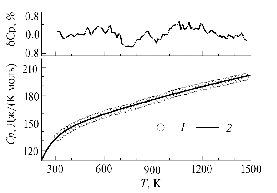 На рис. 2 приведены результаты измерения его теплоемкости в области температур 318–1488 K. Из этого графика видно, что кривая теплоемкости возрастает и не имеет особенностей, типичных для фазовых переходов.