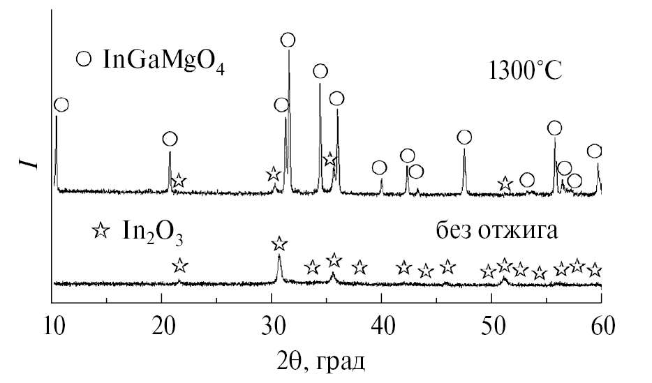 Попытка отжига этих продуктов в течение 10 ч при самой низкой температуре, используемой в твердофазном синтезе (1300°С), привела к получению InGaMgO4 (рис. 3). Однако в отожженном порошке также присутствовало небольшое количество примеси In2O3 (~5 мас. %). Предположительно, для ее удаления необходимо повышать температуру и/или увеличивать длительность проводимого отжига.