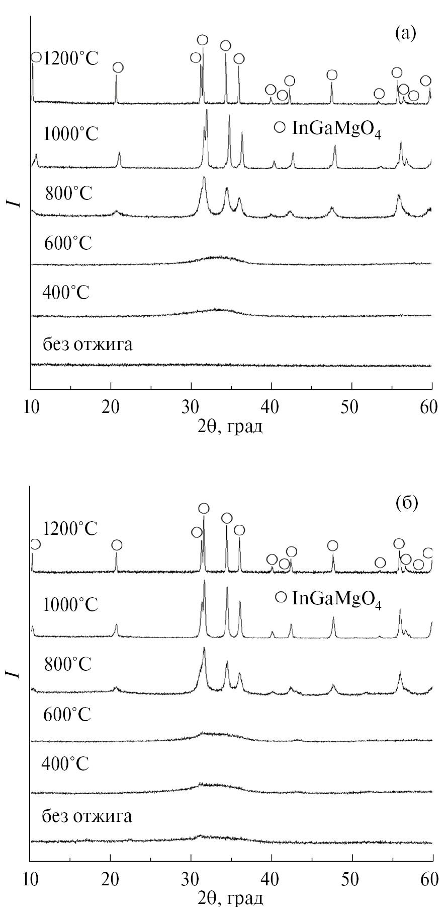 На рис. 4а, 4б приведены рентгенограммы для порошков из КНП и ПНП после их отжига при температурах от 400 до 1200°С. Сравнивая полученные результаты, можно отметить, что оба набора рентгенограмм имеют почти идентичный вид. Как видно из данных РФА, широкое размытое гало, указывающее на отсутствие дальнего порядка в исследуемых образцах, сохраняется даже при повышении температуры отжига до 600°С. На рентгенограммах образцов после отжига при 800°С в обоих случаях появляются слабоинтенсивные широкие рефлексы, относящиеся к фазе InGaMgO4. По-видимому, разрушение рентгеноаморфных органо-неорганических структур, образовавшихся в результате упаривания полимерсодержащих прекурсоров, происходит в интервале от 600 до 800°С. Таким образом, отжиг продуктов нагревания КНП и ПНП уже при 800°С позволяет синтезировать однофазный нанокристаллический порошок InGaMgO4. Как видно из рис. 4а и 4б, отжиг образцов при более высоких температурах (1000 и 1200°С) приводит лишь к увеличению кристалличности InGaMgO4. Параметры элементарной ячейки оксида InGaMgO4 (пр. гр. Rm, Z = 3), полученного после итогового отжига, равны: a = 3.30301(5); с = 25.8067(4) Å; V = 243.827(8) Å3.