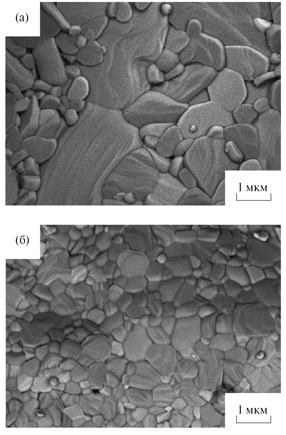 Рис. 5. РЭМ-изображения порошка InGaMgO4, отожженного на воздухе при 1200°С в течение 4 ч: а — КНП; б — ПНП