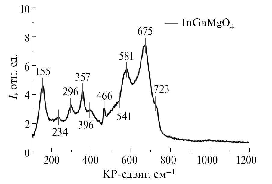 Далее остановимся на результатах спектроскопических исследований порошка InGaMgO4, синтезированного из ПНП. На рис. 6 приведен КР-спектр InGaMgO4 в области частот 100–1200 см–1. Анализируя этот спектр, можно выделить три линии наибольшей интенсивности в областях ~100–200, 250–450 и 500–800 см–1 (рис. 6). Поскольку информация о положении линий КР InGaMgO4 в литературе не найдена, обратимся к данным для изоструктурных ему оксидов.