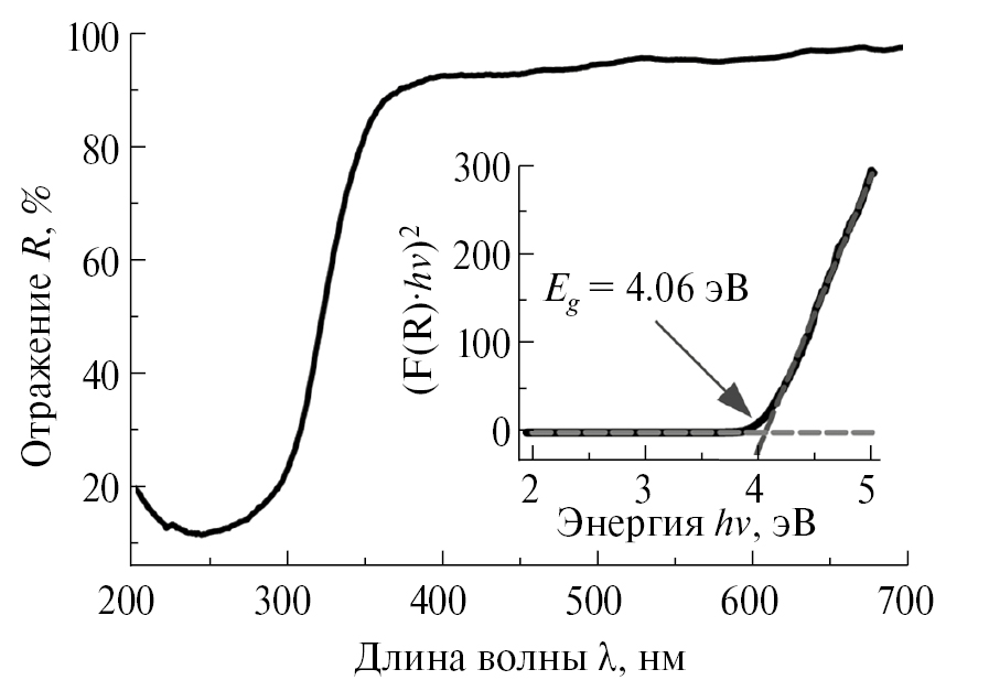 где α — коэффициент оптического поглощения; R — интенсивность отраженного сигнала. Результаты построения данных СДО в координатах Тауца для случая прямых разрешенных межзонных переходов приведены на вставке к рис. 7. Значение Eg, найденное путем экстраполяции линейной части графика зависимости (F(R) hν)2 от hν до пересечения с осью абсцисс, составило 4.06 ± 0.12 эВ. Можно отметить, что полученное значение Eg хорошо согласуется с опубликованным (4.2 эВ) ранее в [1].
