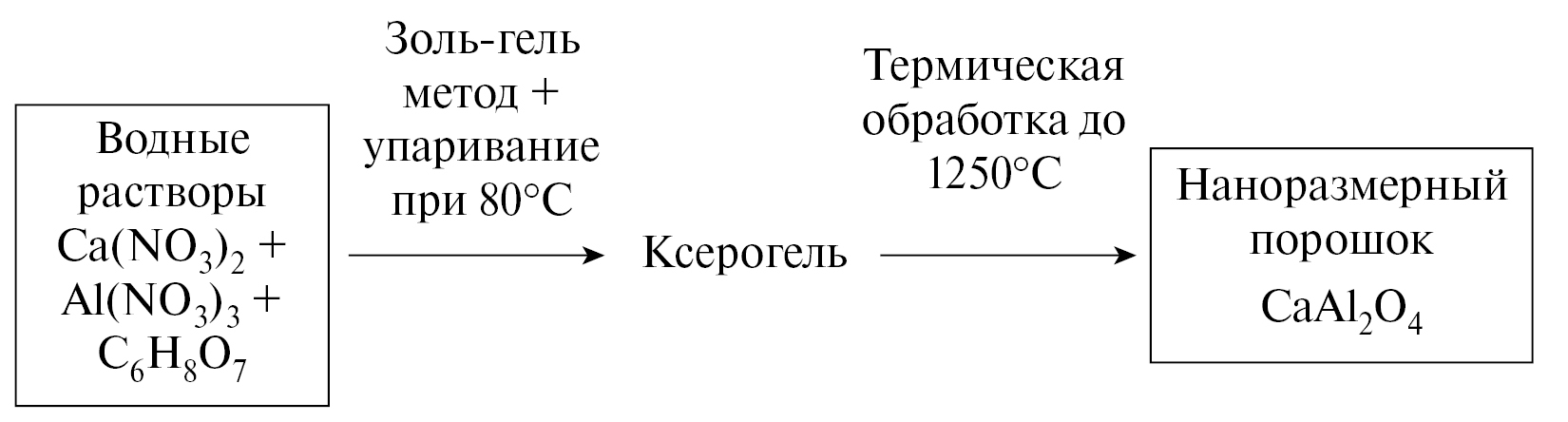 На рис. 1 представлена общая схема синтеза наноразмерного порошка CaAl2O4, иллюстрирующая две стадии синтеза: золь-гель технологию и термическую обработку.