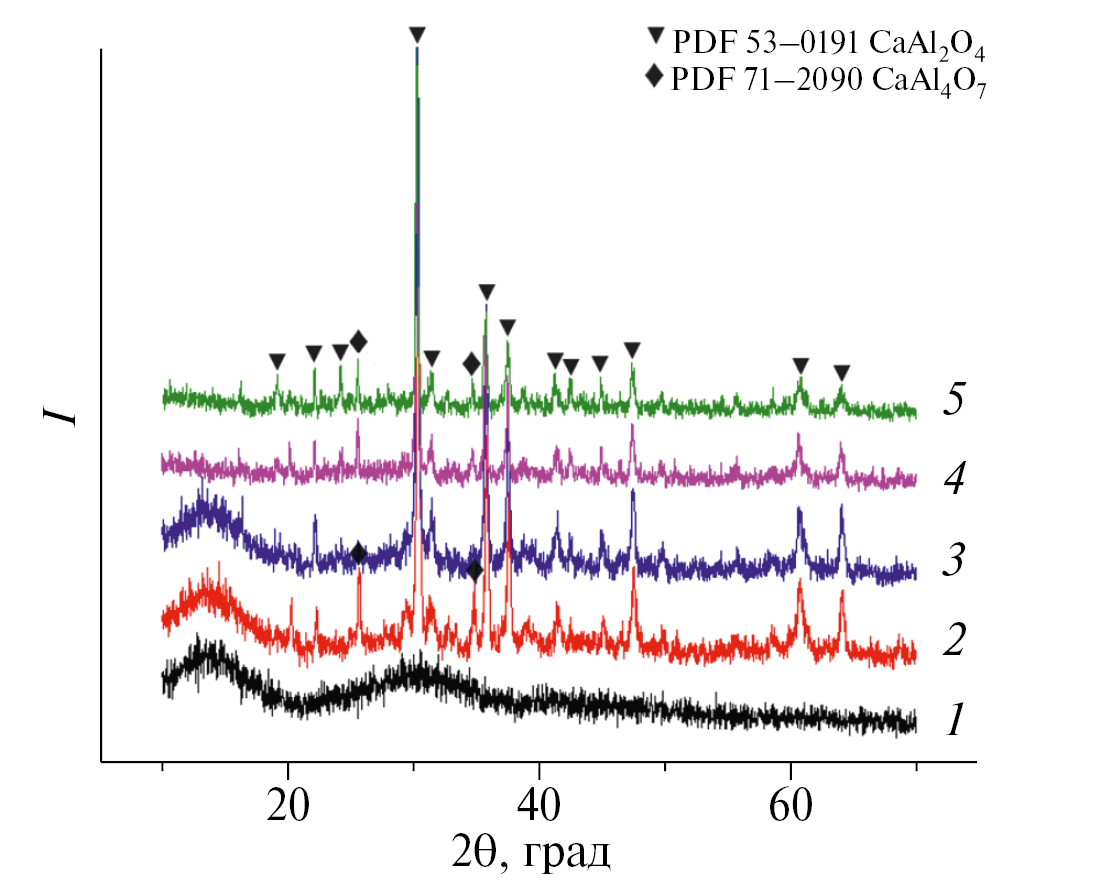 Рис. 3. Дифрактограммы образцов, полученных после термической обработки углеродсодержащего ксерогеля на основе нитратов Ca2+ и Al3+ при температурах 500 (1), 900 (2), 1000 (3), 1100 (4) и 1250°С (5)
