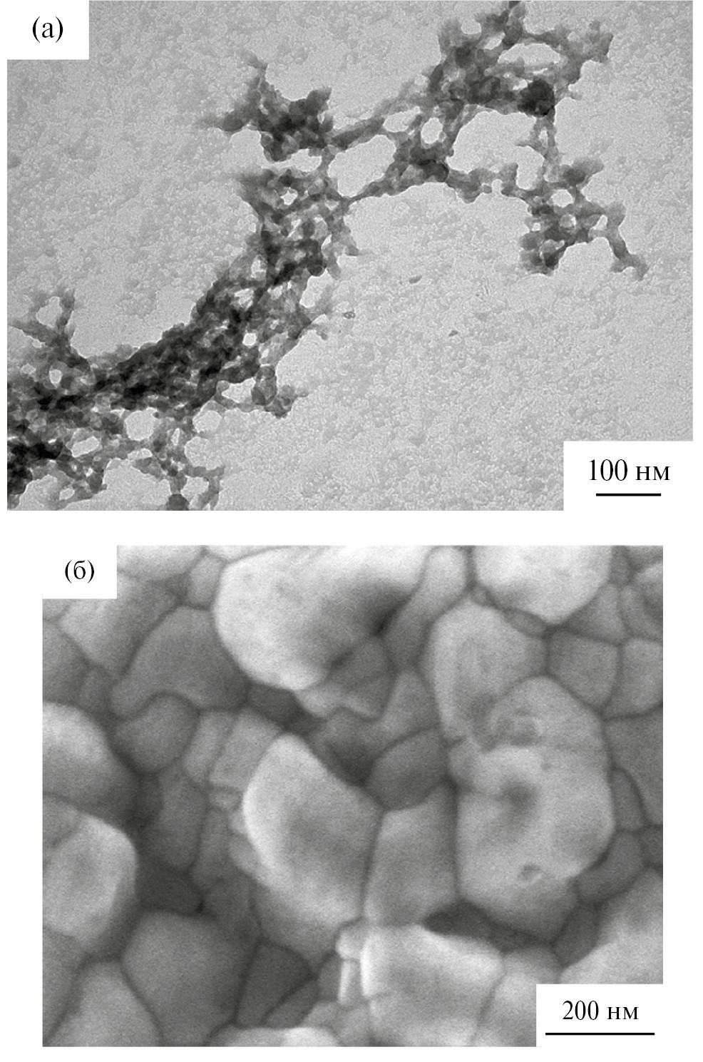 Рис. 5. ПЭМ- (а) и СЭМ-изображения (б) образца, полученного после термической обработки углеродсодержащего ксерогеля Ca2+ и Al3+ при температуре 900°С