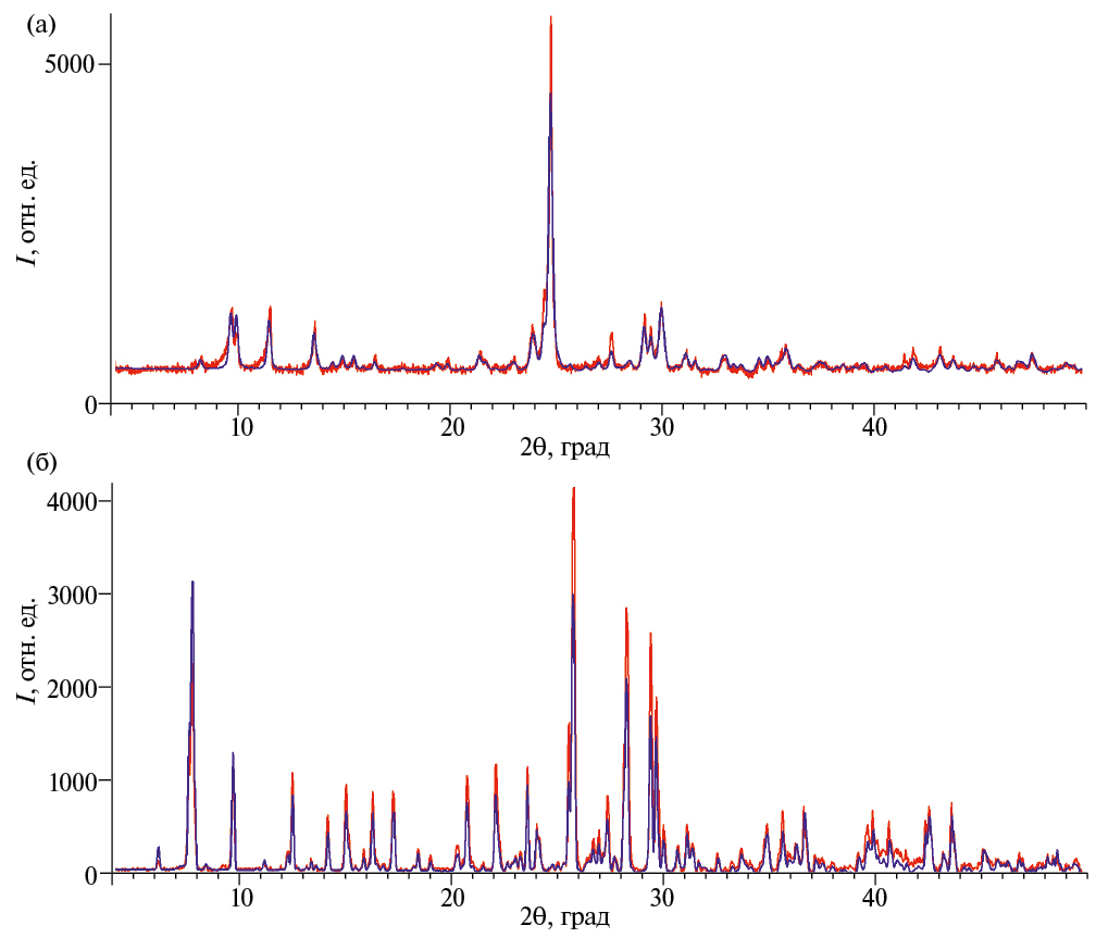 Рис. 4. Порошковые дифрактограммы соединений 1 (а) и 2 (б): рассчитанная из данных РСА (синяя) и экспериментальная (красная)