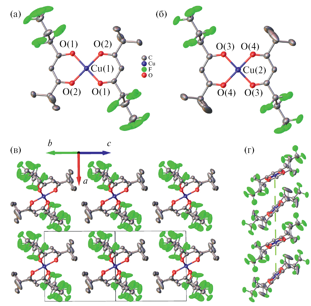 Кристаллы триклинной модификации (II) получены при испарении ацетонитрила из раствора комплекса в токе сухого азота. Параметры элементарной ячейки и детали уточнения структур Cu(fod)2 приведены в табл. 1. В элементарной ячейке триклинной модификации Cu(fod)2 (II) содержатся две симметрично-независимые молекулы (Z = 2, Z´ = 1) с практически идентичным строением (рис. 1a, 1б). Обе молекулы являются центросимметричными (атомы Cu лежат в центрах инверсии), поэтому угол между плоскостями хелатных металлоциклов равен 0°. Сами металлоциклы также довольно плоские, отклонение атомов металлоцикла от среднеквадратичной плоскости составляет не более 0.025 Å для первой молекулы и не более 0.028 Å для второй молекулы. Расстояния Cu–O равны 1.900(2) и 1.898(2) Å для первой молекулы и 1.896(2) и 1.906(2) Å для второй молекулы. Хелатные углы OCuO при этом равны 93.19(9)° и 92.83(9)° (табл. 2). Таким образом, атомы меди в обеих молекулах имеют несколько искаженную квадратную координацию. Расстояние между плоскостью металлоцикла и наиболее удаленным атомом фтора составляет 2.911 Å для первой молекулы и 2.377 Å для второй молекулы, т.е. вторая молекула является более плоской. Упаковка молекул показана на рис. 1в. Молекулы II упакованы в изолированные стопки вдоль направления [011]. Внутри каждой молекулярной стопки (рис. 1 г) чередуются молекулы первого и второго типов, причем центральные атомы меди всех молекул в стопке лежат на одной линии. Расстояние между атомами меди соседних молекул составляет 6.433 Å, а угол между плоскостями хелатных металлоциклов – 21.52°. Углы упаковки (угол между нормалью к плоскости металлоцикла и линией, проведенной через центральные атомы меди) при этом равны 36.01° и 56.96° для первой и второй молекул соответственно.
