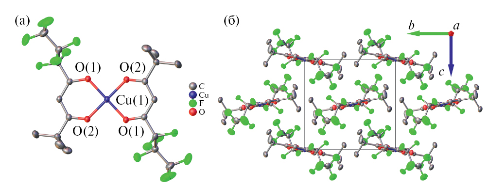 Рис. 2. Структура молекулы (a) и диаграмма упаковки (б) для моноклинной модификации Cu(fod)2 (I).
