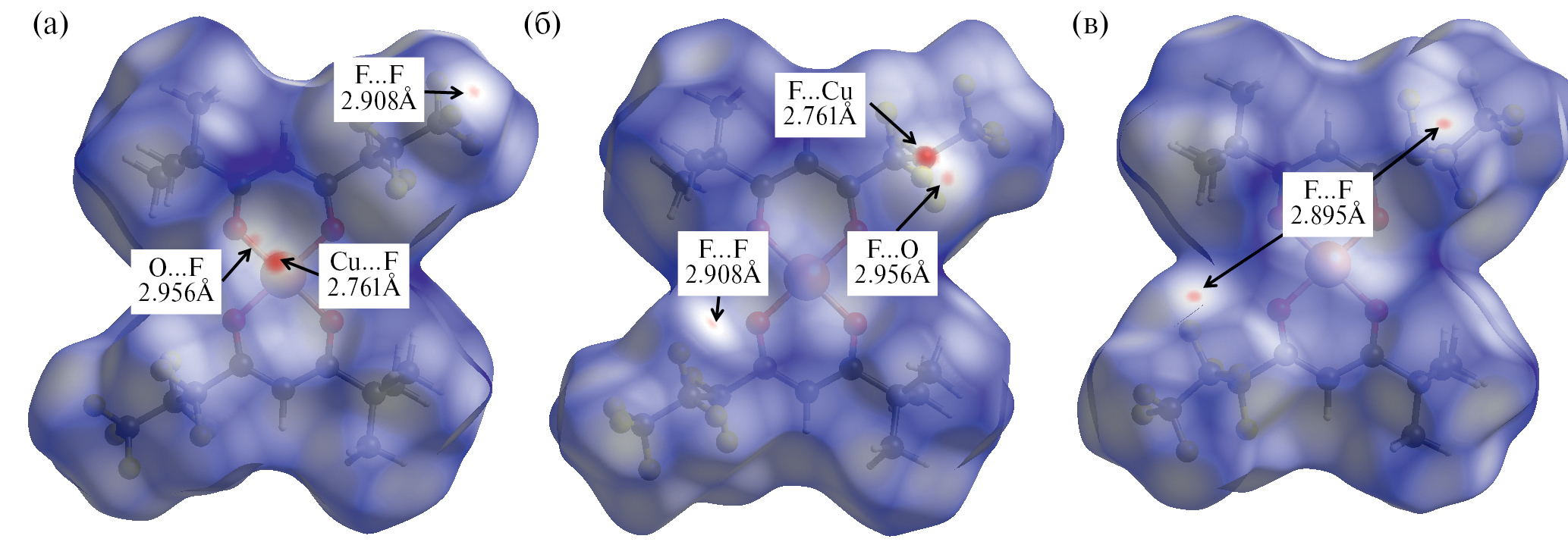 Анализ поверхностей Хиршвельда (ПХ) был проведен в программе CrystalExplorer 21.5 [30]. На рис. 3 показаны поверхности Хиршвельда для молекул обеих полиморфных модификаций, раскрашенные с использованием параметра dnorm (нормализованное контактное расстояние) в диапазоне –0.1…–1.4. На ПХ первой молекулы (рис. 3a) триклинной модификации наблюдаются три красных пятна, которые указывают на наличие близких межмолекулярных контактов. Самое большое пятно в центре соответствует близкому контакту между центральным атомом меди одной молекулы и атомом фтора другой молекулы с расстоянием между атомами 2.761 Å. Расположенное рядом более мелкое красное пятно соответствует близкому контакту O…F (2.956 Å) между тем же атомом фтора и одним из атомов кислорода. Слабовыраженное красное пятно в верхнем правом углу ПХ соответствует близкому контакту F…F (2.908 Å). На ПХ второй молекулы триклинной модификации (рис. 3б) наблюдаются ответные части близких контактов. Таким образом, все близкие контакты в триклинной модификации Cu(fod)2 происходят только между молекулами первого и второго типов, т.е. только внутри молекулярной стопки. ПХ молекулы моноклинной модификации практически не содержит близких контактов, за исключением слабовыраженной пары контактов F…F 2.895 Å. CrystalExplorer также позволяет рассчитать теоретическою величину энергии решетки для выбранного соединения [31]. Для этого вокруг выбранной молекулы в заданном радиусе (10 Å в нашем случае) генерируется кластер молекул. Затем с использованием базисного набора B3LYP/6-31G(d, p) рассчитывают полную энергию взаимодействия между центральной молекулой и каждой из молекул в сгенерированном кластере. Энергию решетки вычисляют как полусумму энергии взаимодействия всех таких молекулярных пар в кластере. Так как в структуре триклинной модификации содержатся две симметрично-независимые молекулы, расчет проводили для каждой из молекул, при этом энергию решетки брали как среднее значение между результатами двух расчетов. Полученные значения равны –154.1 кДж/моль для триклинной модификации и –163 кДж/моль для моноклинной модификации. Разница в почти 9 кДж/моль в абсолютном значении указывает на то, что моноклинная модификация (I) является для молекул Cu(fod)2 термодинамически значительно более выгодной. Этот результат хорошо согласуется с меньшим количеством близких межмолекулярных контактов и более плотной упаковкой молекул в моноклинной модификации.