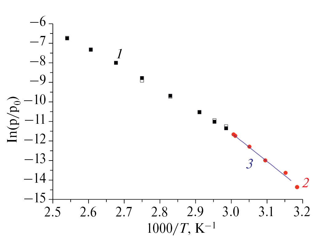 Рис. 5. Температурные зависимости давления насыщенных паров для 1 – испарения, 2 – сублимации модификации I (метод потока), 3 – данные [20] для сублимации (эффузионный метод). Сплошные квадраты – расчет давления на основании данных по количеству вещества, конденсированного в холодной зоне, пустые квадраты – на основании данных по количеству вещества, испарившегося в источнике.