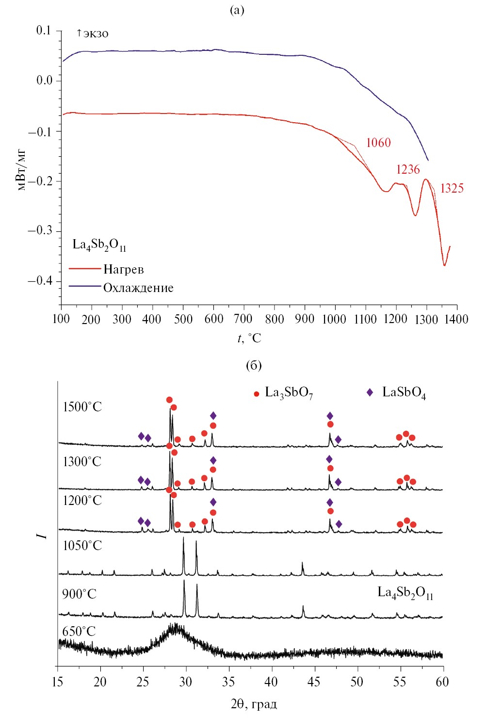 Обнаружено, что La4Sb2O11 существует до температуры 1060°С. На ДСК-кривой нагревания образца в диапазоне 1000–1500°С имеется три эндотермических эффекта (рис. 2а). Первый эффект начинается при температуре 1060°С и соответствует разложению фазы La4Sb2O11 с образованием La3SbO7 и LaSbO4 (рис. 2б). Эндотермический эффект с началом при 1320°С связан с инконгруэнтным плавлением LaSbO4, в результате которого образуется жидкая фаза. Присутствие жидкой фазы создает благоприятные условия для улетучивания оксида сурьмы, поэтому состав образца при охлаждении не соответствует первоначальному. Это объясняет отсутствие эффектов на кривой охлаждения. Другие ранее неизвестные фазы в системе La2O3–Sb2O5 нами не обнаружены.