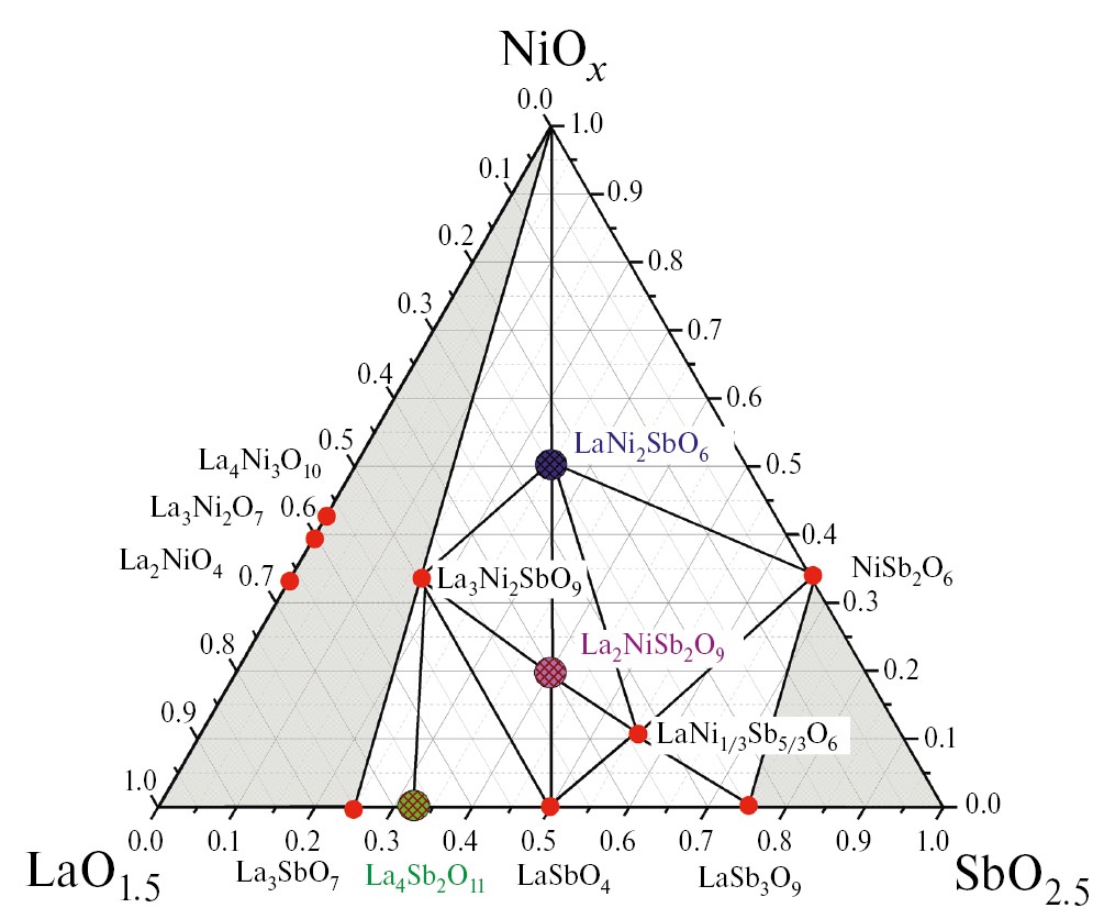 Таким образом, на основании имеющихся данных следует считать системы La2O3–(Ni/Co)О–Sb2O3 недостаточно изученными. В настоящей работе приведены результаты исследования фазовых равновесий в субсолидусной области систем La2O3–(Ni/Co)O–Sb2O5.