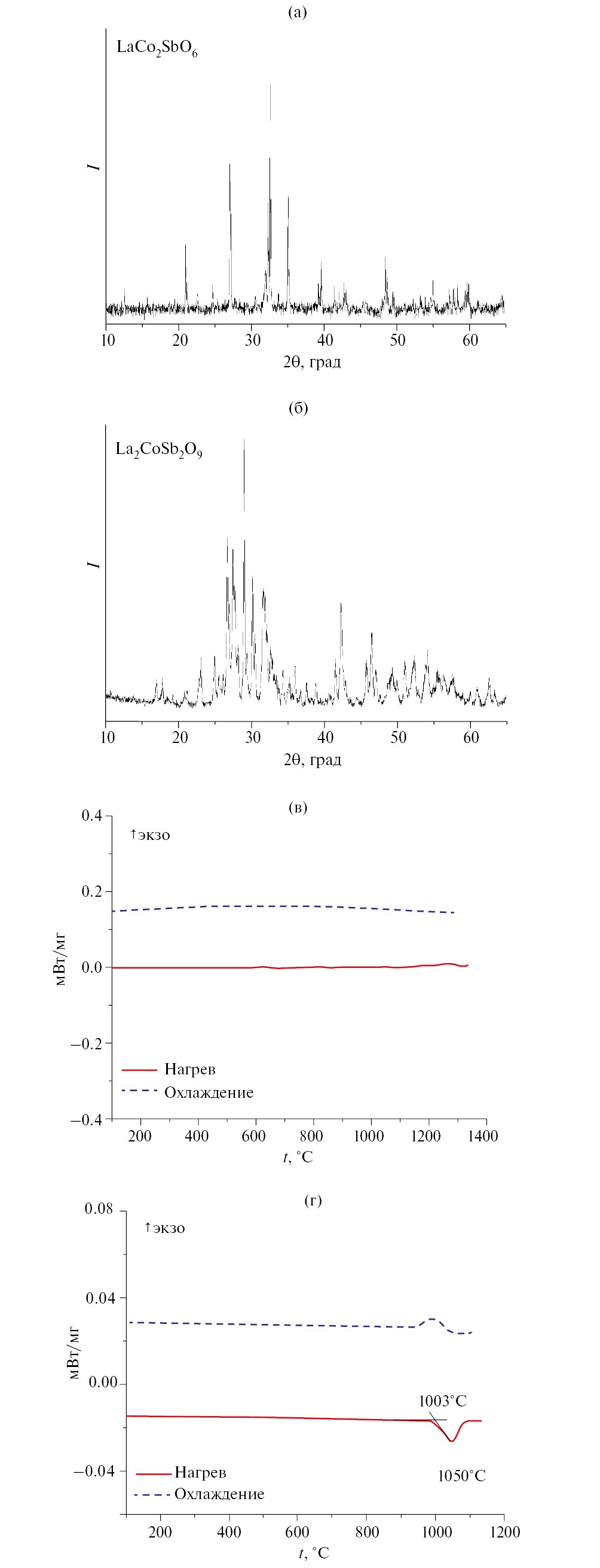 Рис. 3. Дифрактограммы (а, б) и ДСК-кривые нагревания (в, г) тройных оксидов LaNi2SbO6 (а, в) и La2NiSb2O9 (б, г)