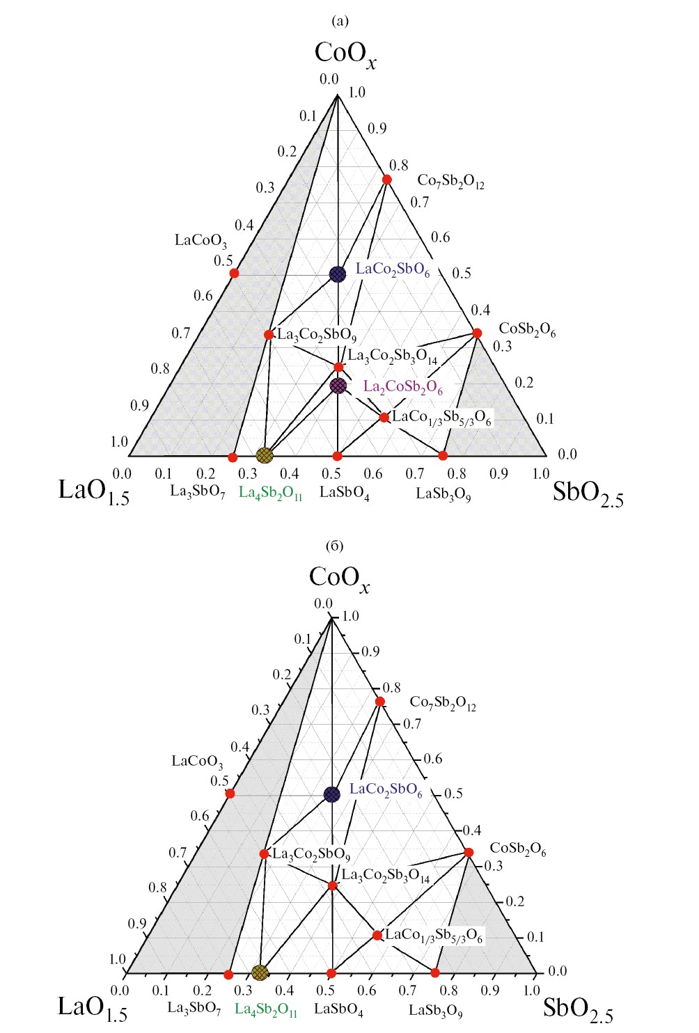 Рис. 6. Изотермические сечения системы La2O3–СоO–Sb2O5 при 900 (а) и 1050°С (б)